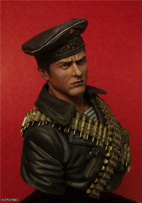 Понравились патроны в ленте. Кожанка (кроме воротника) Понравилась аккуратность - и кант на бескозырке, и звездочка, и всякие мелкие детальки. И то, что ты приглушил оттенок лица на более естественный.