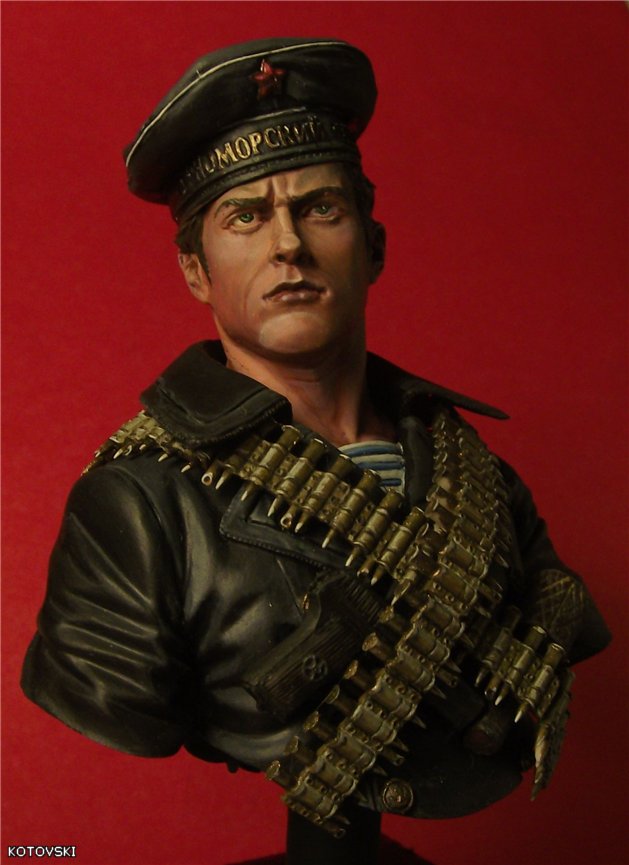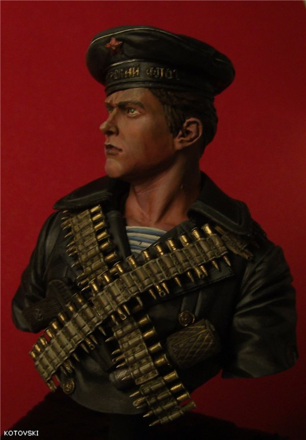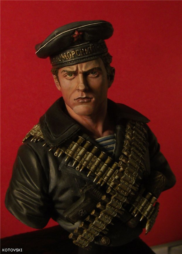 Первое впечатление-вообще офигенно!Но почитав отзыв Д.Шишкова пару ляпов всё-таки обращают на себя внимание-бушлат как кожанка и тельняшка ВДВшная с голубыми полосками.Но лицо,как по мне,очень здорово вышло.