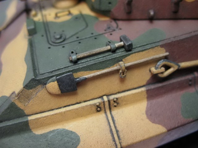 Модель собрана из коробки с минимумом переделок. Переделал всё пластмассовое навесное оборудование (топор, лопата, ножницы, кувалда, лом, тубус для антенн и др.) чтоб было по возможности максимально реалистичным, для чего использовал дерево, иглы от шприцов, многожильный провод. Добавил спаренный пулемет, трубки вентиляции топливной системы, ручку на крышке люка двигателя, радиоантенну, «остеклил» командирскую башню. Переделал решетки воздухозаборников на надмоторной бронеплите (у производителя они имеют вид жалюзи), считаю, что сетка более уместна. Здесь пригодилась смекалка супруги – были использованы сменные сетки для электробритвы (может кому идея пригодится ?!).