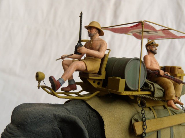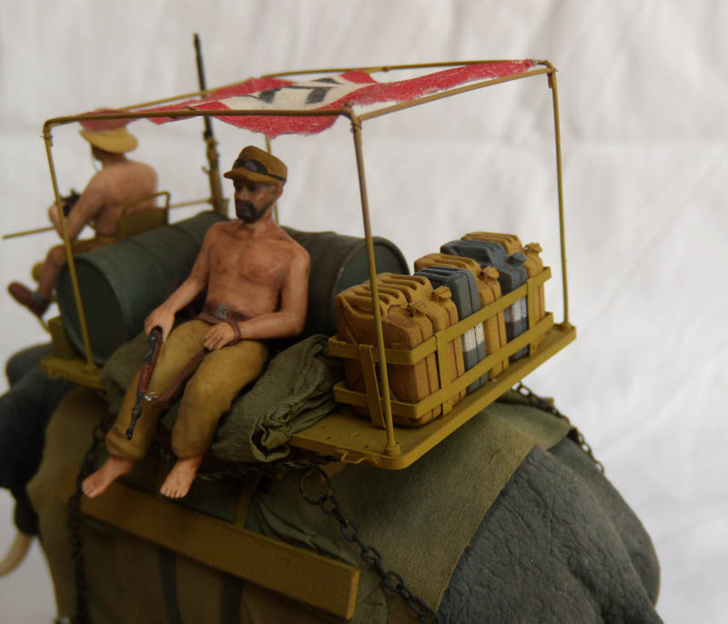 Модель слона лепилась из пластики. Внутри каркас из проволоки и заполнитель из дерева(для уменьшения расхода материала. Фигурки - погонщик - перепиленный радист из Кюбельвагена. Вторая фигура сборная. Роспись вышла не очень, но это первые мои фигурки, которые не стыдно показывать :). Платформа из проволоки и полистирола, флаг - тонкая ткань.