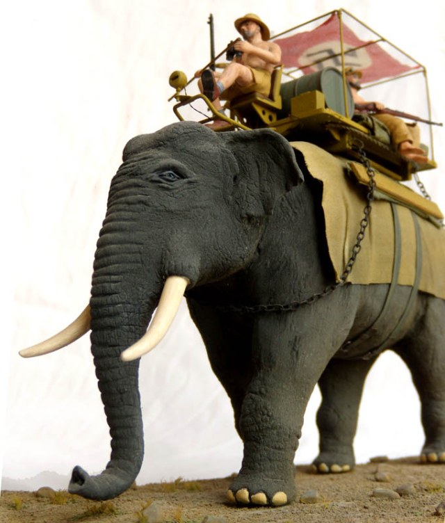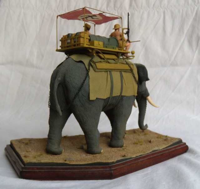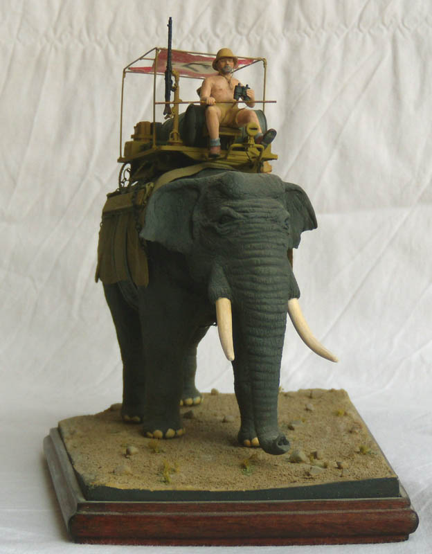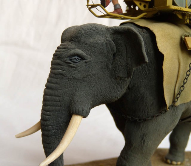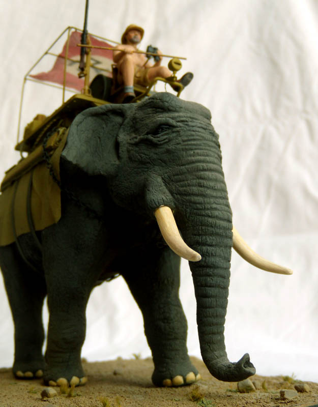 В описании указывается африканский слон (хотя в работе виден индийский). В действительности ИМХО, индийский несколько светлее и "серо-бурее" что-ли. Оттенок фигуры ближе к окрасу африканского так называемого саванного. К слову, в отличие от африканского лесного, саванец хуже поддается дрессировке. Оба обитают южнее Сахары. Есть сомнения, что его можно использовать в военно-гужевых целях, особенно там, где стреляют, и пустыне. Индийские слоны, те и то более "домашние", а без воды их на работы не выводят, от жажды могут стать агрессивными.
