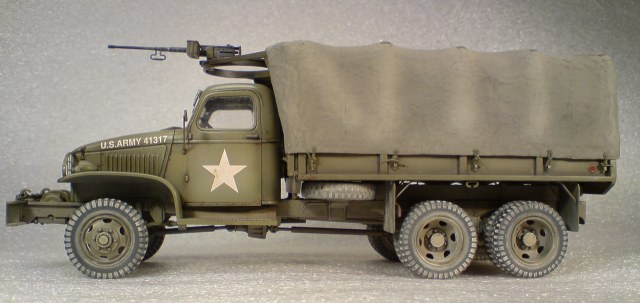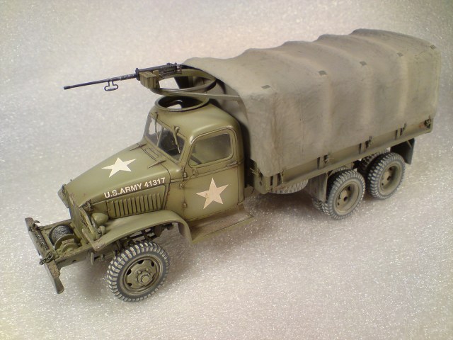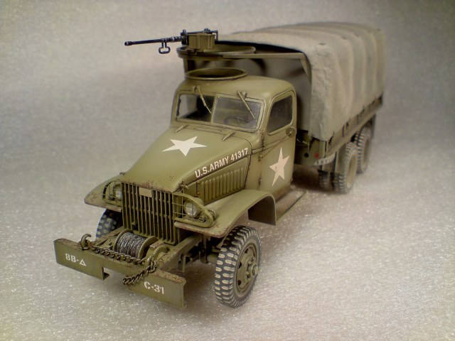 *Доброго времени суток всем,хочу выставить в прихожую свою новую модель.Прототип называется-грузовик GMCCCKW 353 A/или по простому-Джим/.Машина эта родом из 40-х,в прямом смысле,рабочая лошадка Второй Мировой.Выпущено было 23500 таких машин разных модификаций.На Каропке уже имеется достаточное количество Джимов/но думаю ещё один в хорошем хозяйстве не помешает/Модель эту уже длительное время делает Италери,кит достаточно старый и,по моему,с такой кабиной Джима больше никто не выпускает.Сборка изкоробочная,с лёгкой “косметикой”-авто собирается без проблем/Итал как Итал/Из доделок-тент/бумажный-первая моя попытка/,решётки на фары,ручки-крючки на кабине,стёкла лобовые и заднее заменил на упаковочный прозрачный пластик,цепь на лебёдку так и не нашёл нормальную-пришлось тулить более-менее похожую.В первый раз решил испробовать нарисовать сколы и ржавчину/местами вроде получилось,местами-не очень/.Красилась машинка нитроэмалью/тент –акрил тамиевский/,заливка-масляные краски,сколы-питерская темпера,немного припылил пигментом*Ну вот вроде и всё,жду ваших отзывов/суровых ,но справедливых/*