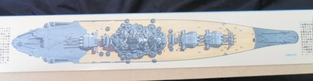 Тамия постаралась сделать довольно болшую упаковку (760 X 245 X 70)очень красивой. На лицевой части очень деталированно изображен линкор MUSASI. На боковичках коробки, в цвете, изображен линкор в соответствии со схемой окраски, причем есть и вид сверху, тоже в цвете, так что начинающему моделисту нужно будет очень постараться чтобы покрасить палубу не в цвет дерева.