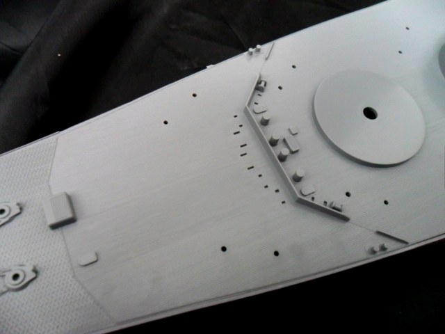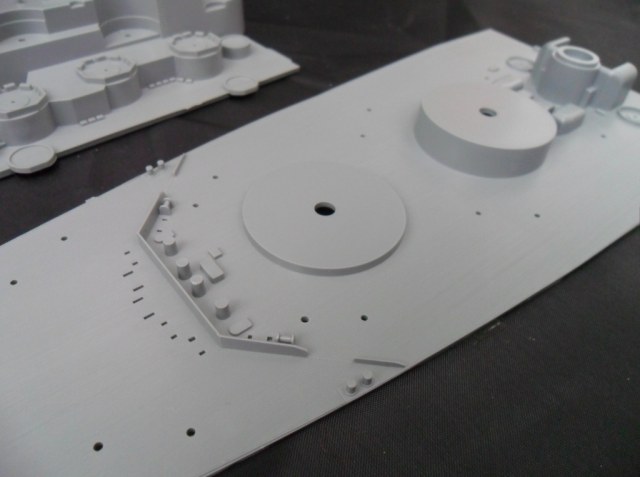 Главная палуба модели дана из двух половин, кот. запакованы в отдельный пакет. Прозводитель отделил от рамок эти детали, за что заслужил отдельный респект, т.к. от остатков литников уже деваться некуда. На палубе сразу отлиты элементы надстройки, которых ну очень много, якорные цепи, дельные вещи и.т.д. Вот как раз на палубе и вышел основной и грубейший косяк этой именитой фирмы, т.к. расшивка под деревянный настил дана НАРУЖНОЙ!