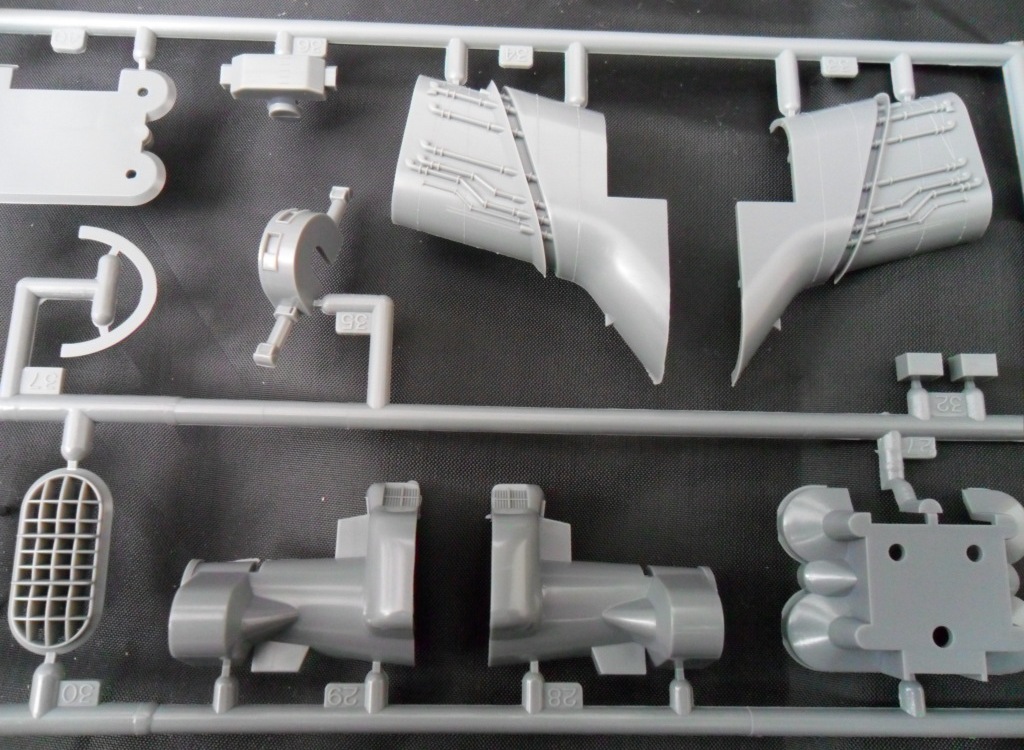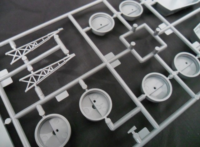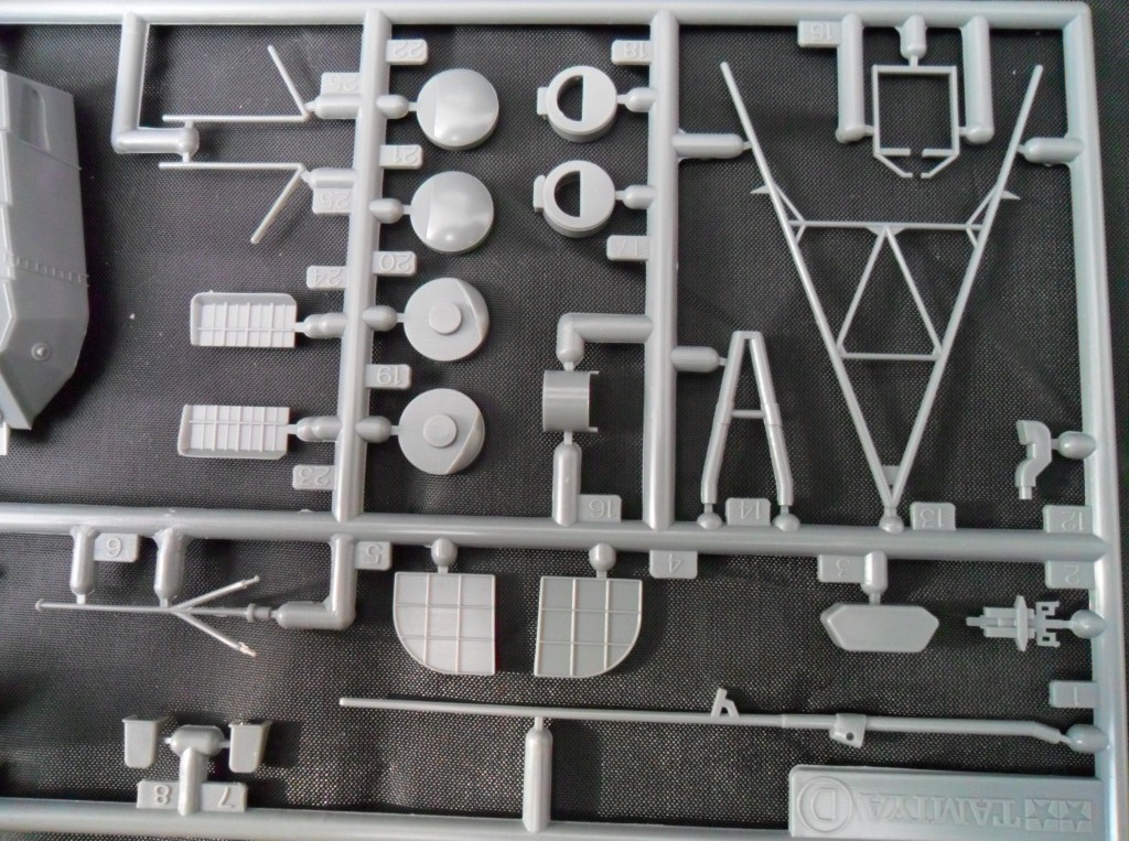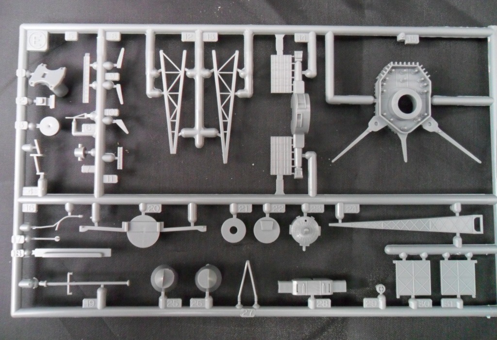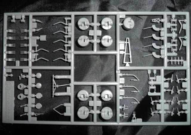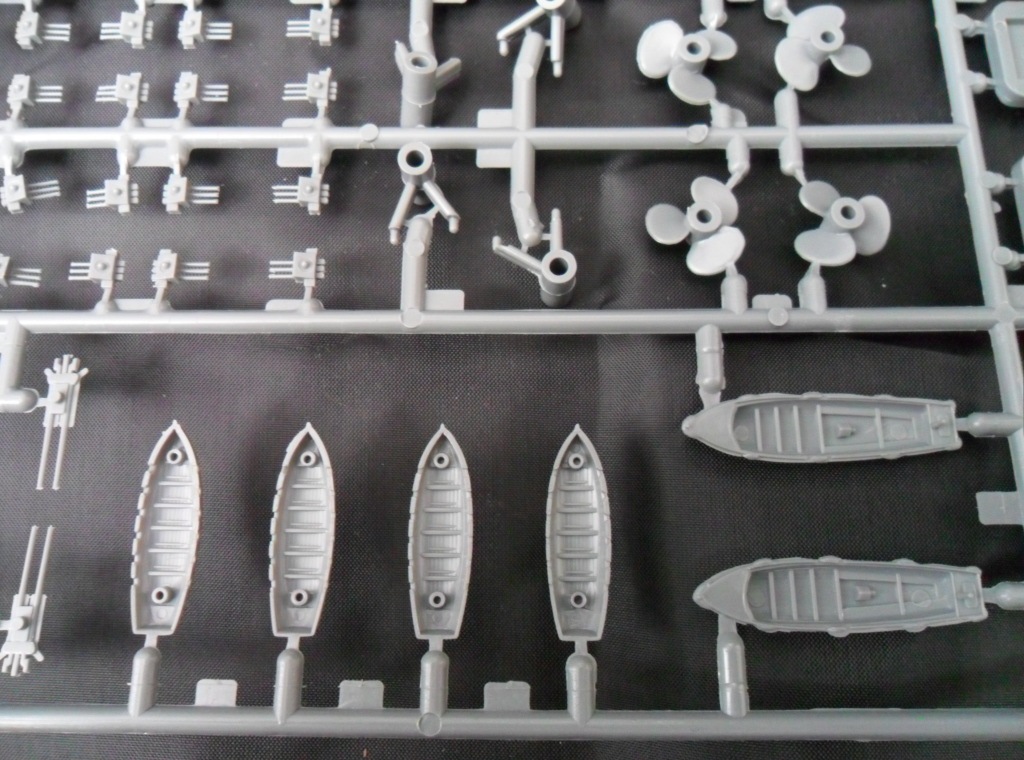 Если во всех пакетах были упакованы по два литника, то в маленьком пакете разместилось сразу три одинаковые рамки с деталями, на кот. можно найти многочисленные зенитные орудия, шлюпбалки, прожектора и.т.д., в общем мелочева.