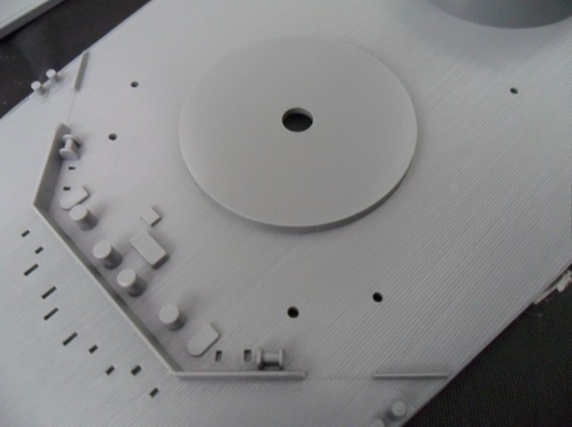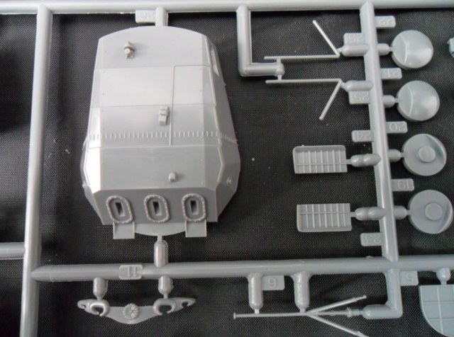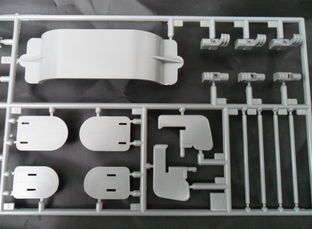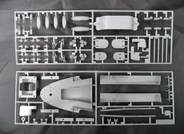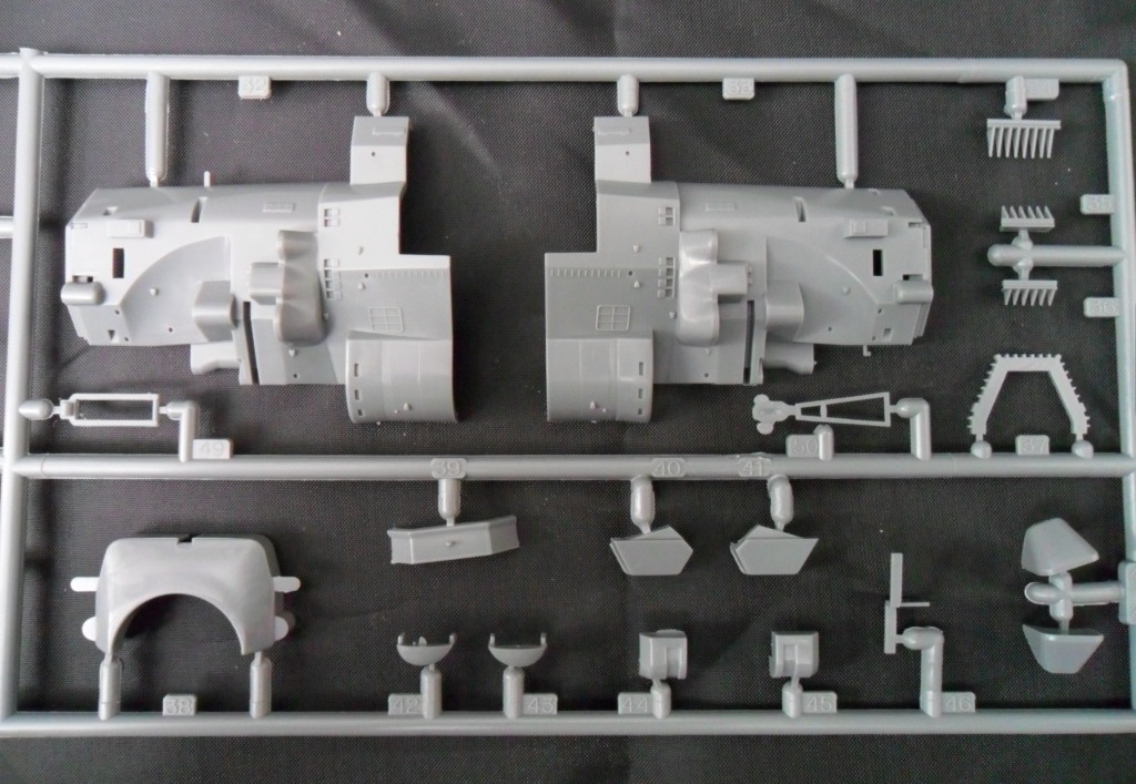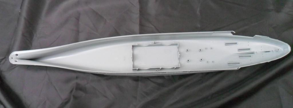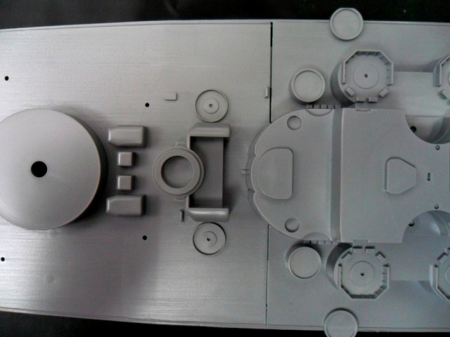 Корпус, как уже отмечалось, изготовлен цельным (левая, правая половина и днище в сборе). Теоретически, это упрощает, и намного, работу над моделью. Всё отлито аккуратно, без облоя и серьезного смещения прессформы. Внутри ванны корпуса отлиты ребра для размещения оборудования ходовой модели.