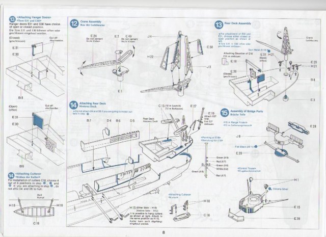 Инструкция у японцев серьезная - поместилась на 16 страницах. Второй лист инструкции рассказывает о том, как превратить модель в кораблик с моторчиком. Текст инструкции на английском языке, в картинках и цифирьках, до кучи каждый этап сборки снабжен финишной фотографией , правда в черно-белом цвете.