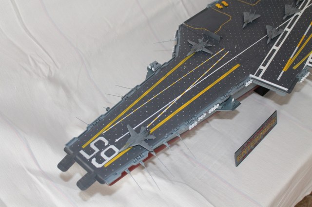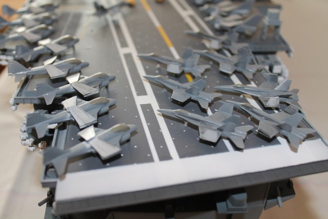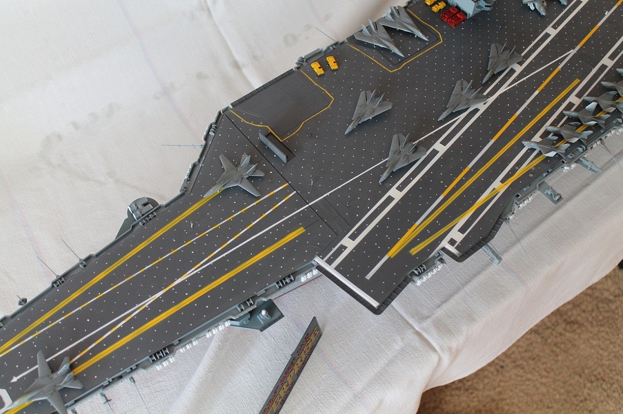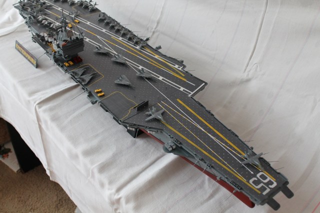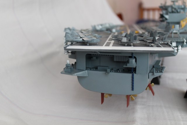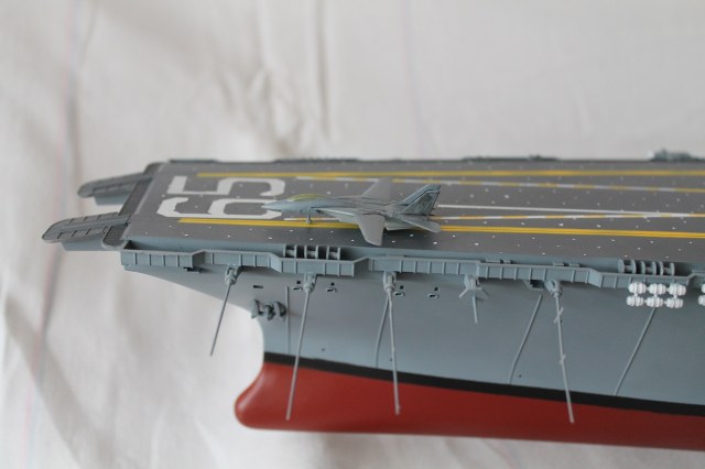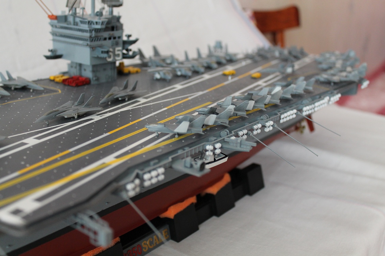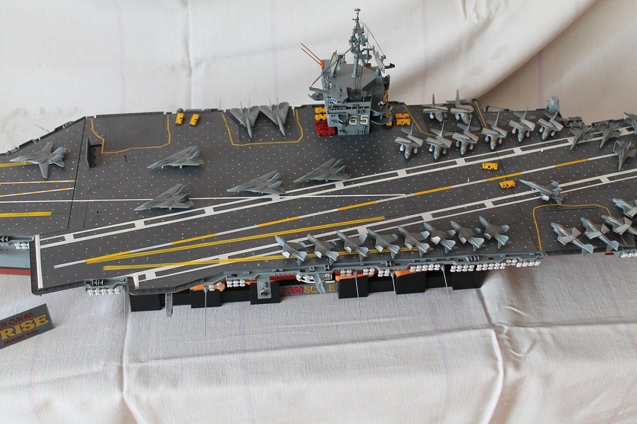 Очень масштабная (объемная) модель. Хорошая окраска корабля. Но самолеты, ужас они не живые. Если посмотреть на фото американской палубной авиации там такие попугаи (по окраске), даже учитывая маленький масштаб можно было бы их покрасить поитересней хвосты покрасить в черный или красный цвет.