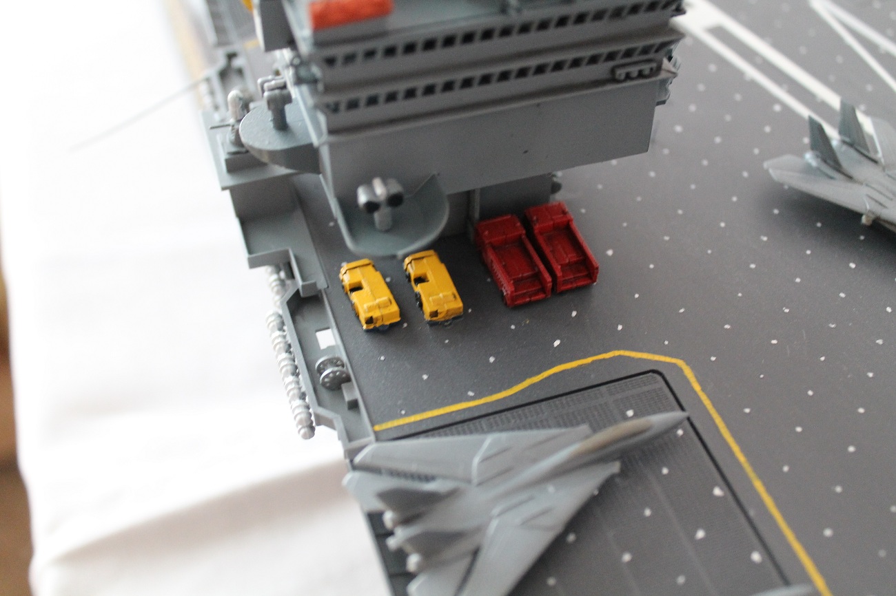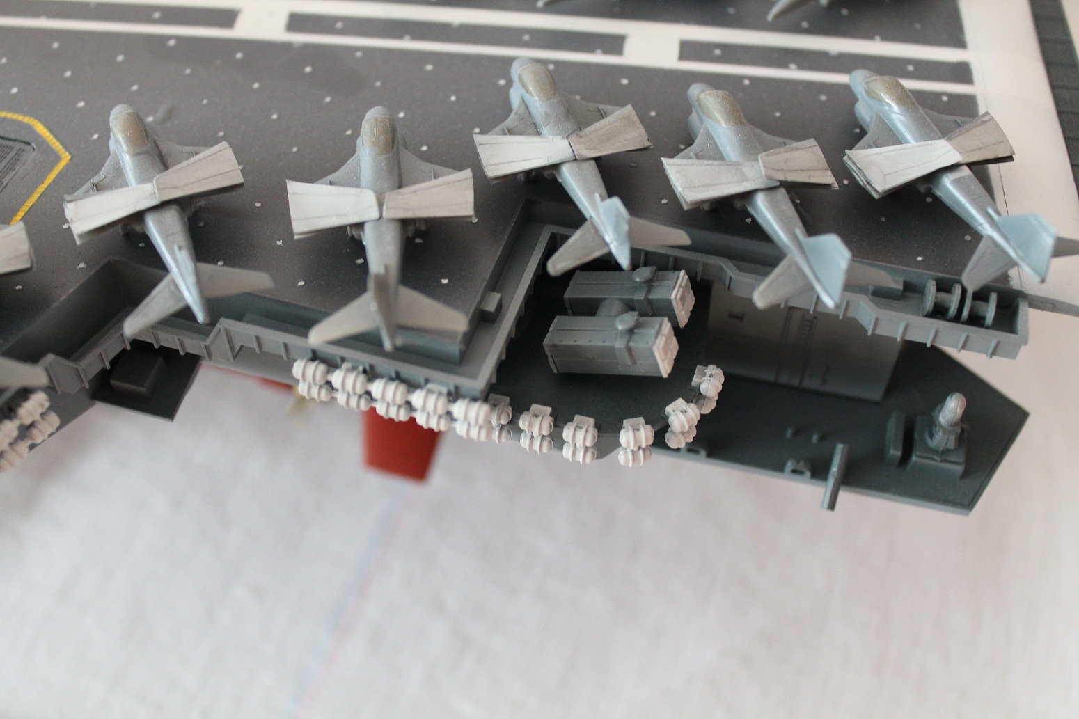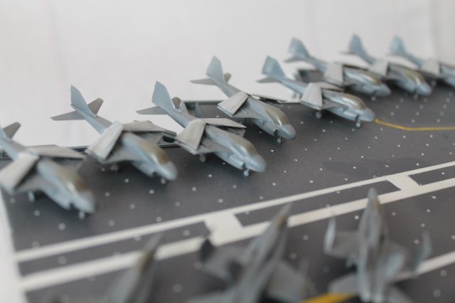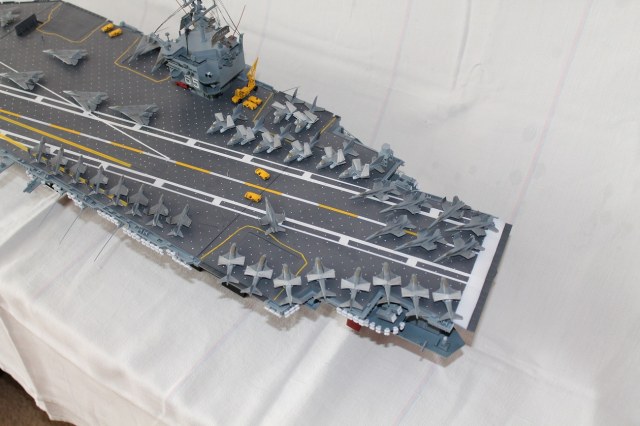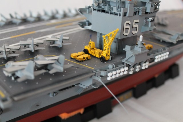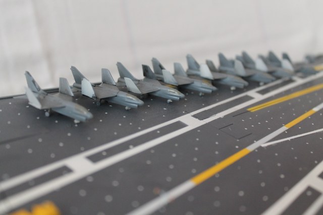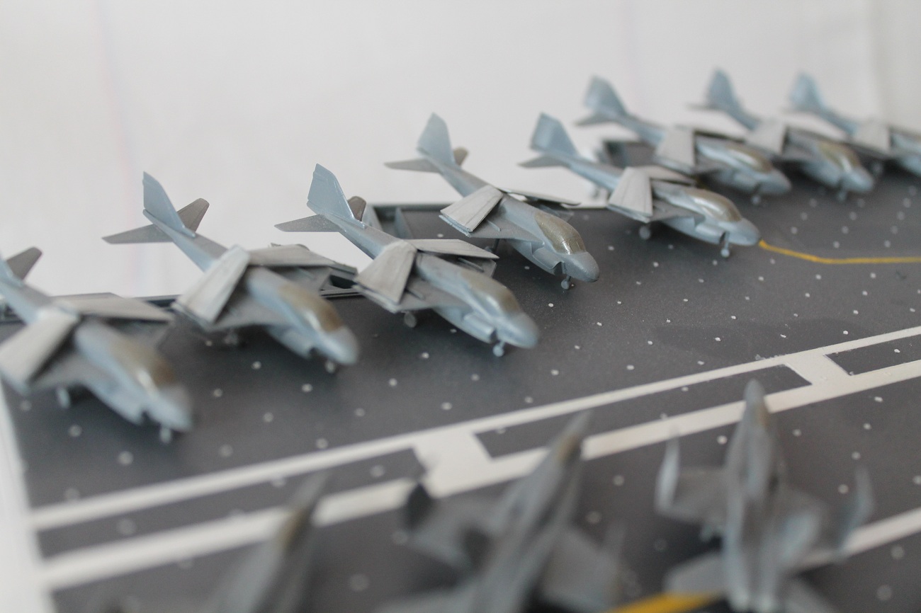 Очень масштабная (объемная) модель. Хорошая окраска корабля. Но самолеты, ужас они не живые. Если посмотреть на фото американской палубной авиации там такие попугаи (по окраске), даже учитывая маленький масштаб можно было бы их покрасить поитересней хвосты покрасить в черный или красный цвет.