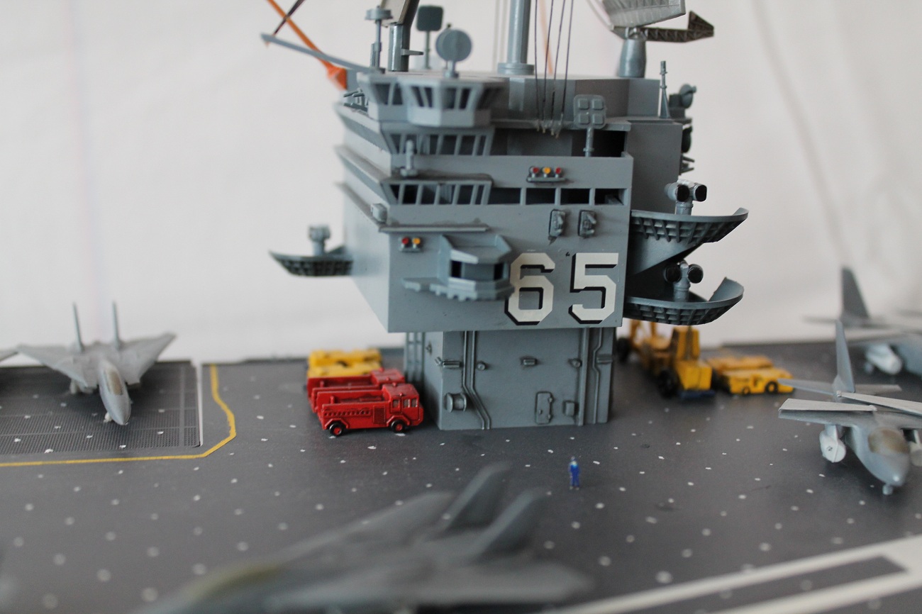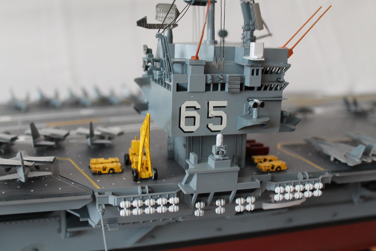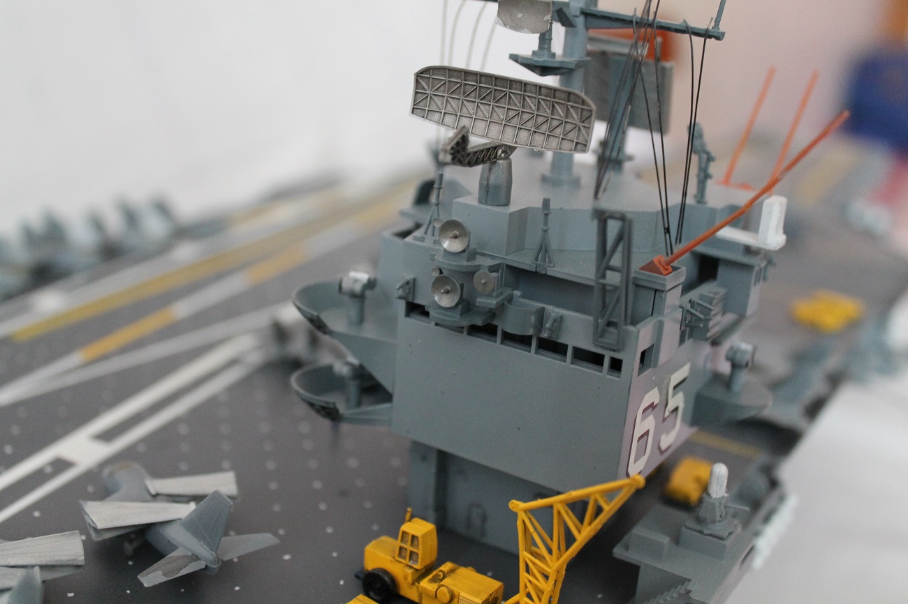 Ну, немного о модели. Модель собиралась четыре месяца, основные трудности по данной модели были самолёты. Потому-что маленькие очень. А так всё хорошо. Некоторые задают вопрос, почему именно «Тамия»? Просто, купив как - то "Звезду", мне пришлось много попилить. Потом люди посоветовали попробовать "Тамию". Мне очень понравилась деталировка, четкость стыков. Люди говорят:- " Налей клея в коробку моделью от "Тамии", потряси, модель сама соберётся". Модель была покрашена в базовый цвет ВМФ США, как показано в инструкции. Фантазировать побоялся - опыту мало. Попытался сделать тонировку на надстройке и самолётах.