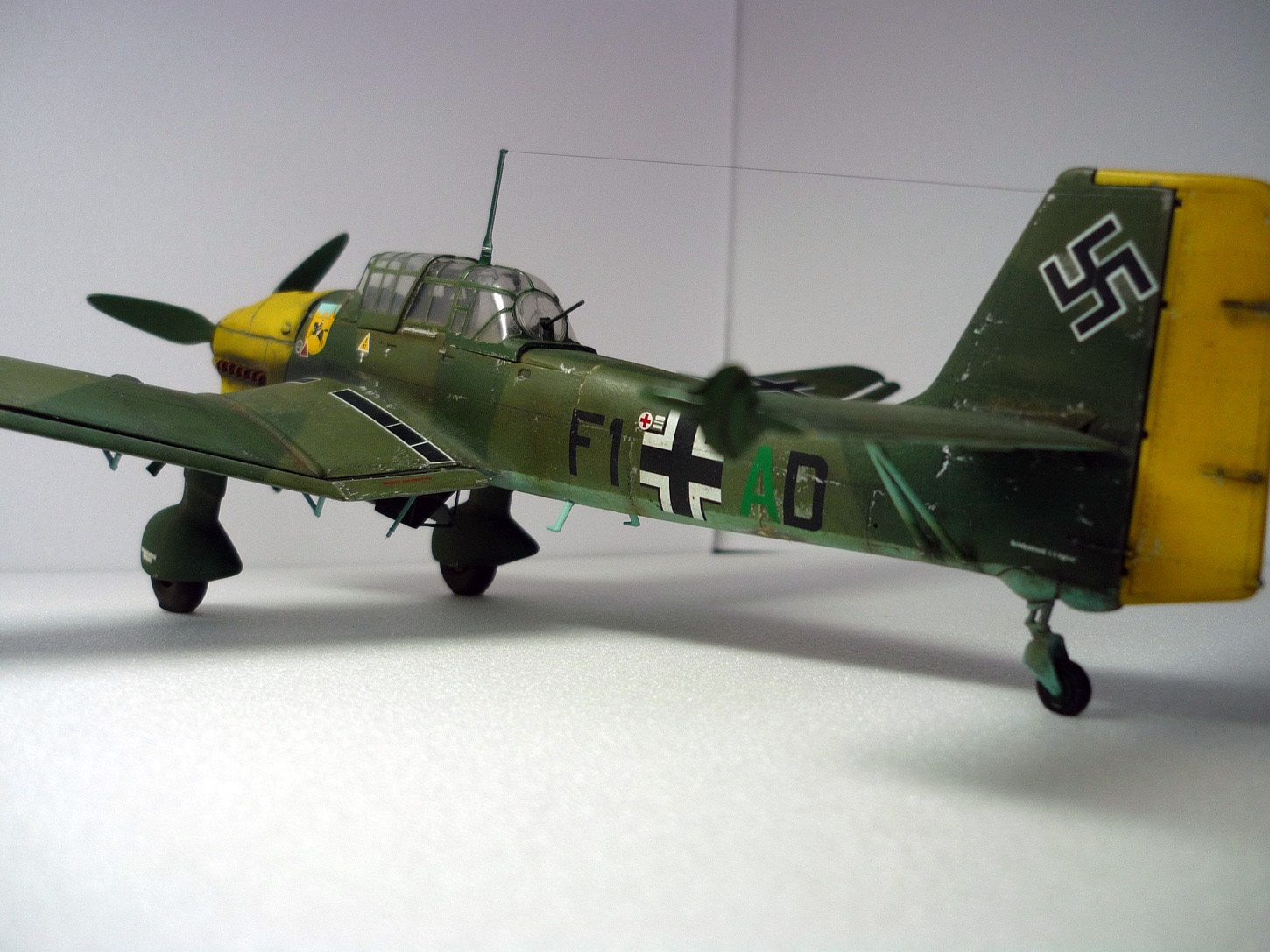 Наконец то закончил Штуку. Делалась модель долго,с перерывами ......проблемм со сборкой не было. На КАРОПКЕ есть обзор данного КИТА,так что описывать его не вижу смысла. Сборка из коропки...доработки минимум-пулеметы,пито-иглы,..антенна-нить из бантика,..и кое где фольга самоклейка.Докупил лишь смоляные выхлопные патрубки(на фото они есть) Окраска аэрограф. красил аканом(первый раз акан попробовал-очень понравилась краска)- верх. низ бомбы-wallejo. Грунт-ABRO из балончика. При покраске загубил переднюю часть фонаря((( грунт попал под него....как ни пробовал не отмыл. Заменить бы его,да где ж его(фонарь) взять? Оставил как есть.... Свастики не было в наборе...добыл из своих запасов! На тормозные решетки декаль не стал наносить...накрасил с помощью масок. Смывка делалась маслом на уайт-спирите, тонировка пастелью. Выхлоп и нагар -тоже пастель. Сколы- частично зубочистка,частично тонкой кистью. Жду критики!))
