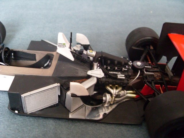 Это первый опыт в сборке модели авто такого масштаба (1/20). В процессе постройки возникли некоторые сложности с корпусом болида - пришлось его перекрашивать. Не буду всё подробно описывать - но в ходе всех отмывочных работ, он покрылся шагренью, как будто комочки краски вросли в пластик. Как мог выровнял его, но всё равно идеально ровную поверхность уже вернуть не удалось. Так же потерялись родные зеркала - пришлось выпиливать "неоригинал" из литниковой рамки.