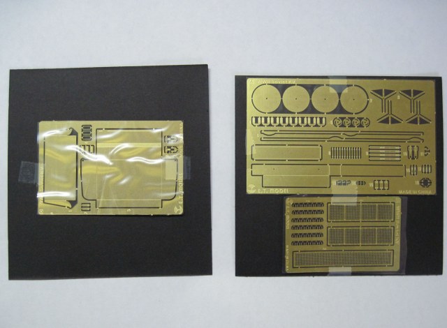 В небольшом пакетике (15 на 11 см.) размешаются две картонки с закрепленными на них 5-ю платами фототравления (3 платы с деталями для ящиков ЗИП, плата с деталями люков и малого ящика, плата с решетками МТО) и инструкция формата А4. В общем скромно и без особых излишеств. Отмечу, что плата с решетками МТО по ощущениям тоньше и мягче остальных. Решетки ранние, без скосов в передней части.