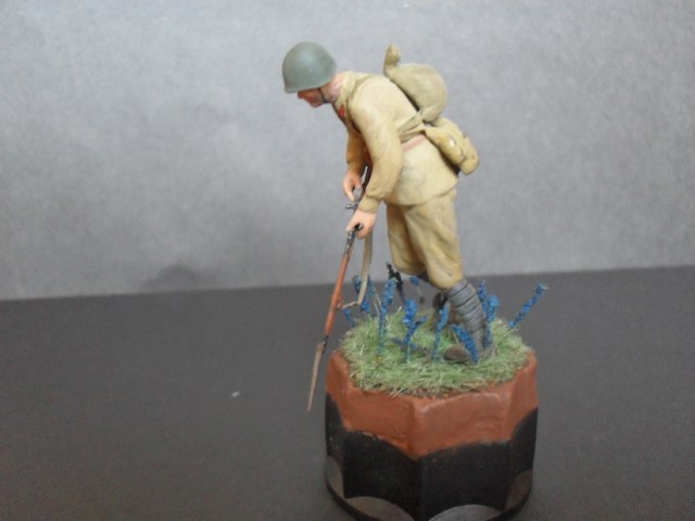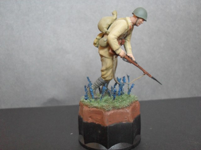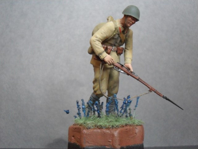 У всех остается от наборов разные запчасти,вот и я перебирая литники решил собрать фигурку-солянку. Нижнея часть взята от советских пулеметчиков фирмы звезды,причем каждая нога от разной фигурки,туловище взято от старого набора звезды пехоты,руки и каска от фирмы МВ ,амуниция,оружие тоже звезда.Подставка временная сделанная на крышке от краски от звезды,окраска красками хома и звезда.Вот такой получился красноармеец -солянка