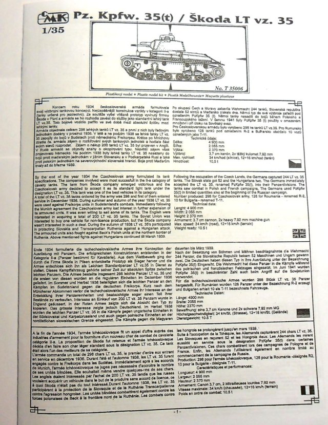 Приветствую коллег-моделистов! Представляю обзор чешского танка LT vz. 35 Skoda или PzKPfW 35 (t) по классификации вермахта от чешской компании "СМК". На сайте был обзор подобной модели от "Тамии", которая является перепаком "СМК", однако формально чешская модель не обозревалась.
