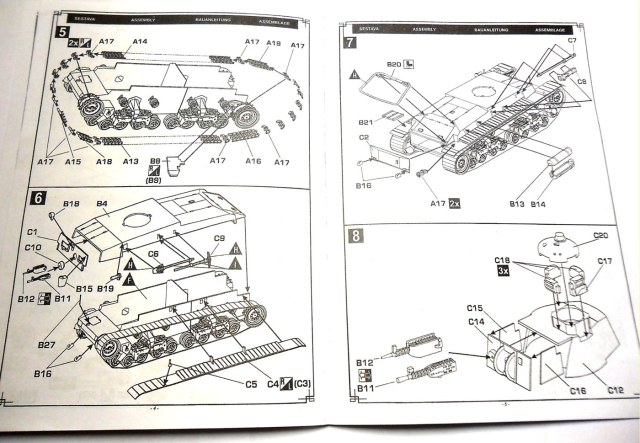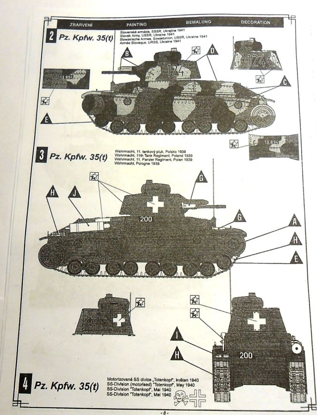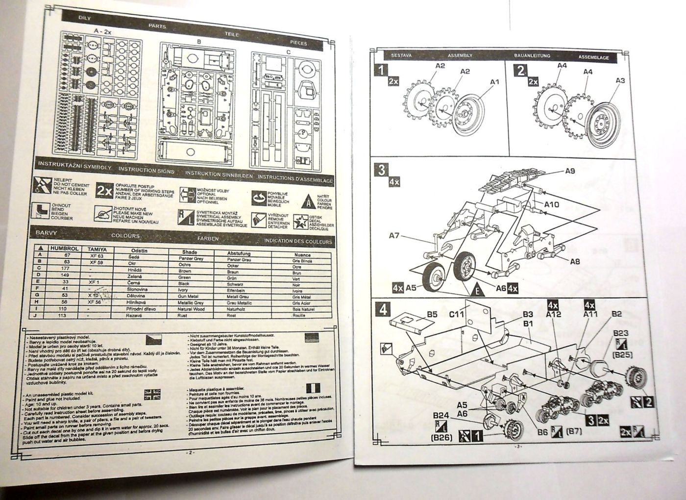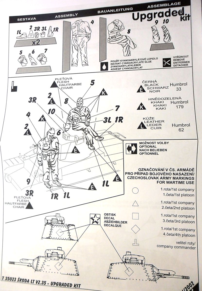 Инструкция в виде маленькой книжицы в половину стандартного листа на 4 листиках. Она черно-белая, с минимальным текстом, но, в принципе, все понятно. Даются варианты окраски машины в цвет чешской армии, в "панцергрей" и камуфляж вермахта. Также есть дополнительная отдельная инструкция на одном листе со схемой сборки фигурок и еще вариантом окраски чешской армии и схемой нанесения чешских ОЗ.