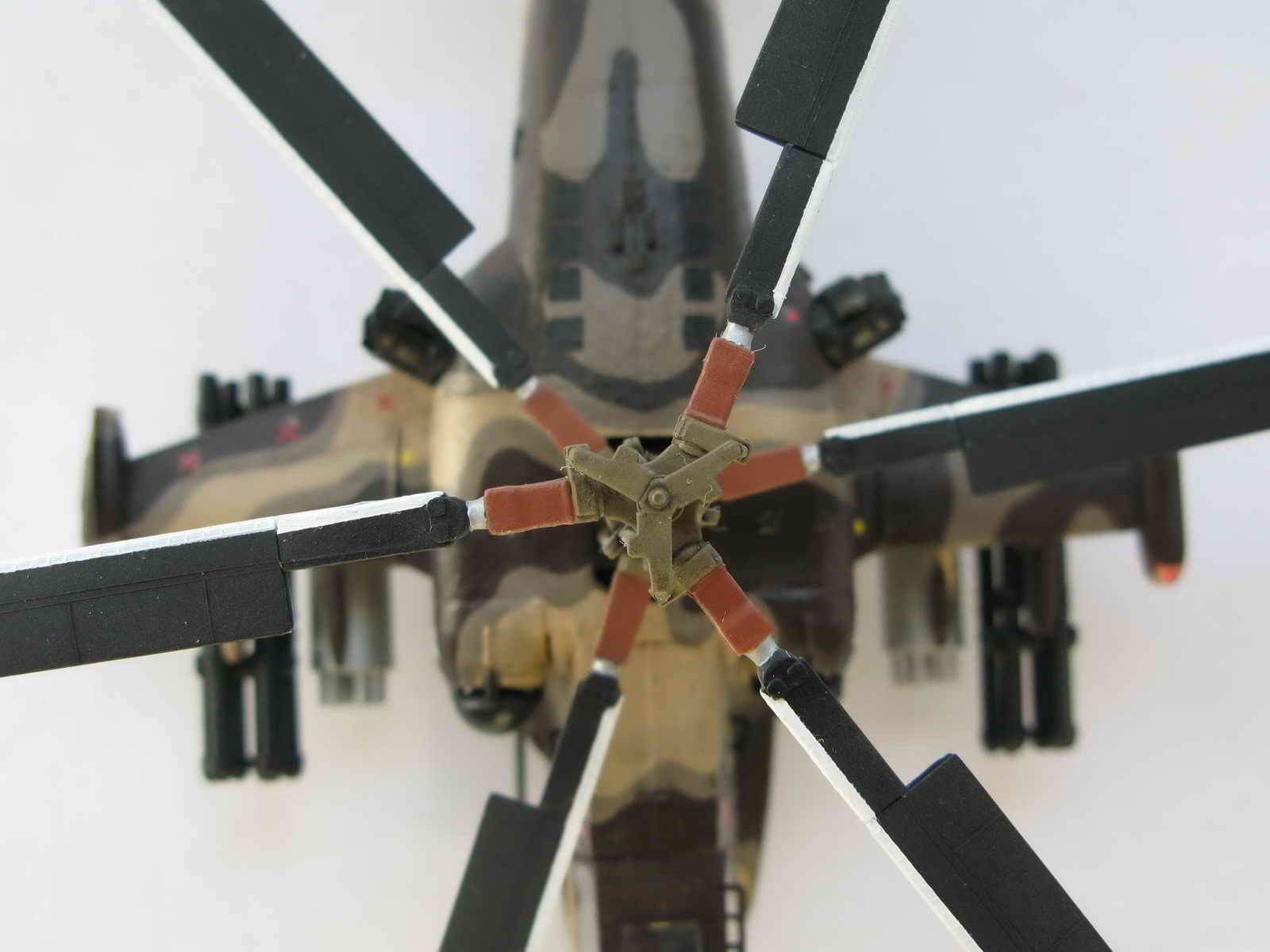 От себя практически ничего не добавлял. Ограничился провисом лопастей, рассверливанием блоков НАР и ствола пушки. Немного укоротил родные поручни. Конечно хотелось бы добавить от себя побольше, но давит очень долгая стройка - хотелось уже наконец-то завершить свою первую работу.