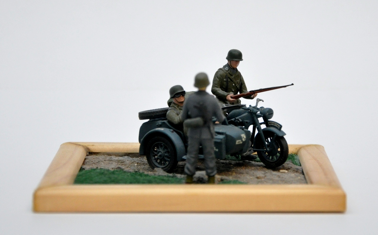 смотря на роботу невозможно не заметить что автор очень старался но имхо ваша виньетка смотрится немного игрушечно, неестественные позы и еще нужно бы потренироваться над росписью фигур да и смывка мотоциклу не помешала бы..