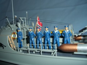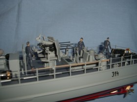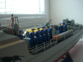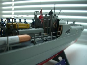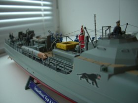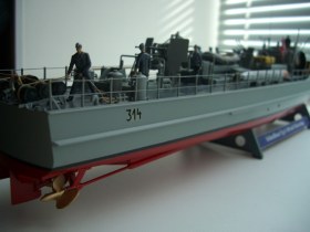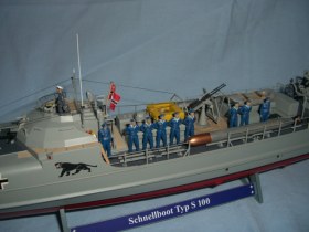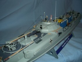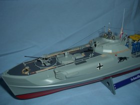 Использовались данные катера на всех театрах боевых действий-от Балтики до Черного моря.На их боевом счету более 40 военных и свыше 100 гражданских судов.Длина 34.94м,скорость 42 узла,дальность плавания 700 миль.Вооружение:торпедные аппараты 533мм и 4 торпеды.Артиллерийское вооружение было разнообразным,так на катерах устанавливались 20мм пушки,автоматические 37мм,40мм,а также различные варианты пулеметов калибра 7.9мм.Некоторые катера оборудовались направляющими для сброса глубинных бомб или постановки мин.Окрас балоны тамия,кисть-акан.Переделаны леера,добавлены фигуры.ПОЛНЫЙ ХОД...