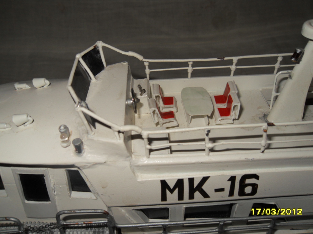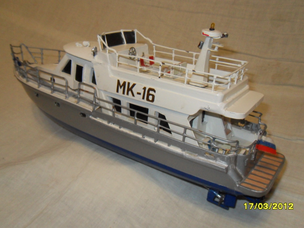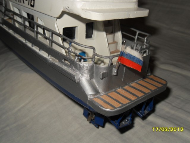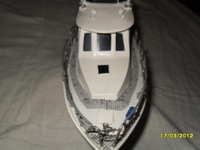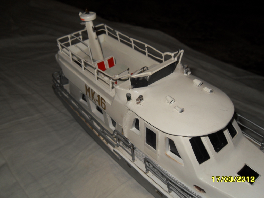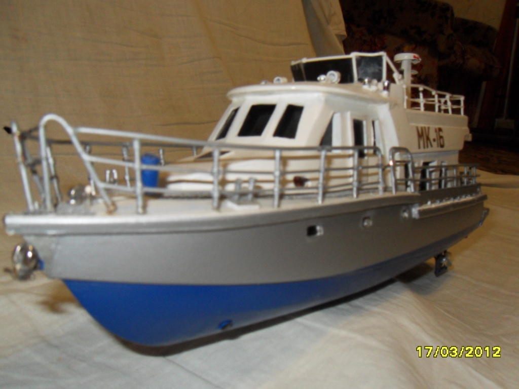 Модель была сделана в ДОСААФе год назад. С тех пор ничего не менял. Корпус из берёзовой болванки. Надстройка - вагонка для отделки наружных помещений и пол ведра шпаклёвки=) Окна - фотоплёнка. Леера - медная пленка. Стойка антенны ( или как она правильно называется ) из консервной банки. Краска - нитра и серебрянка.