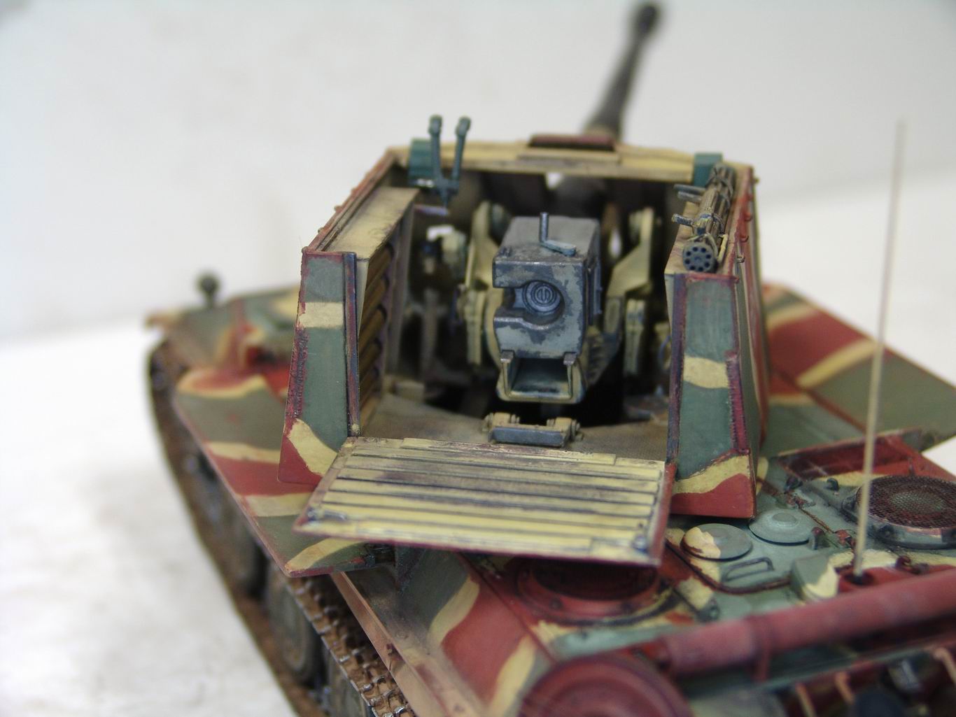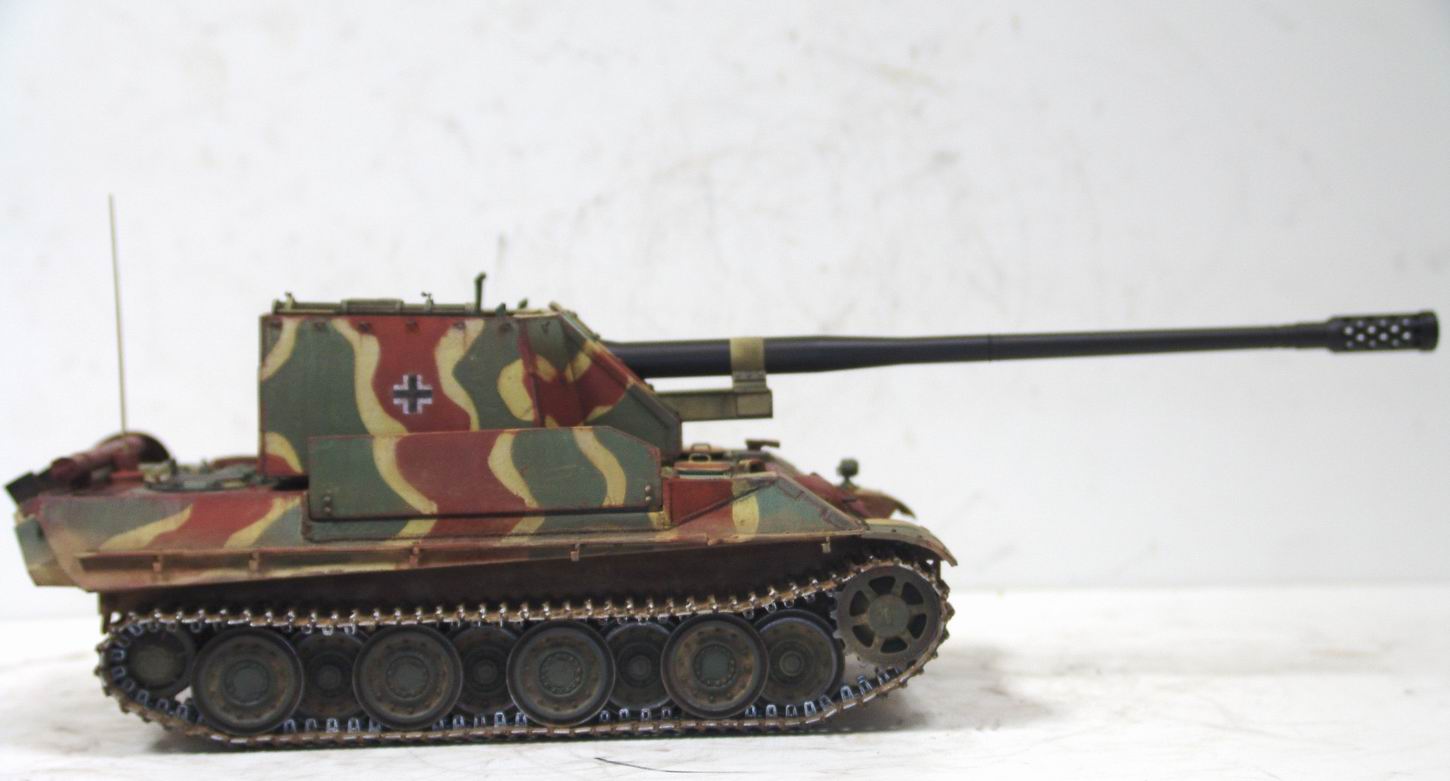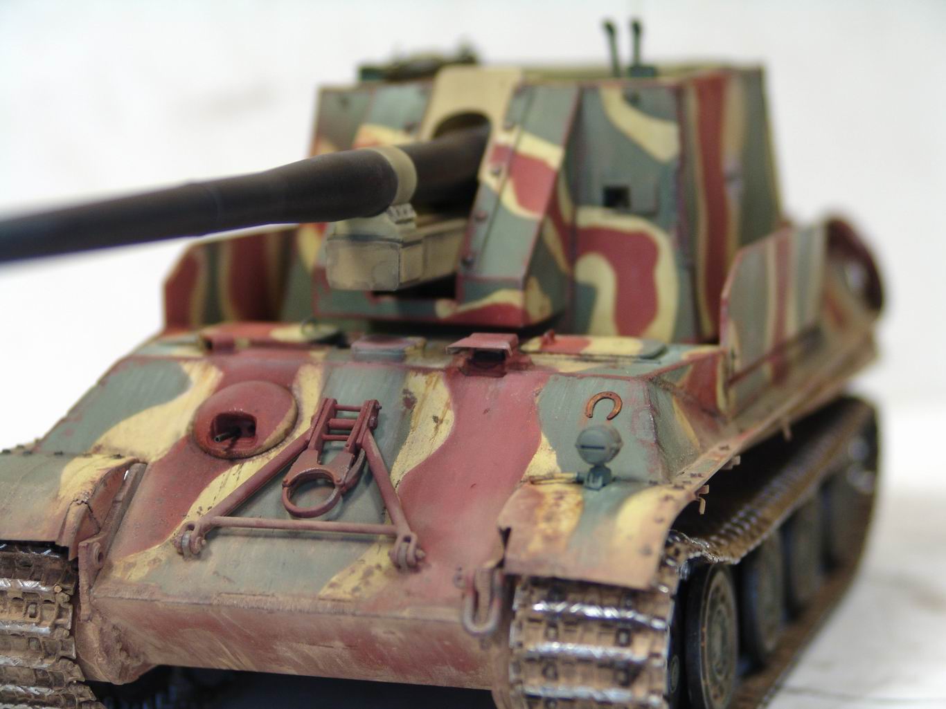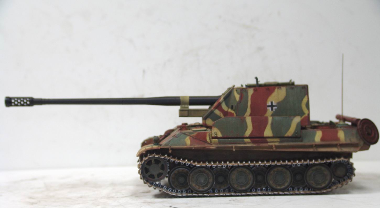 Выношу на обсуждение модель истребителя танков 128 мм PanzerkanoneGerat 5-1213 Reinmetall- Borsing, или другими словами Ягдпантера II. По данным известного исследователя немецкой бронетехники Вальтера Шпильбергера машина была разработана к середине 44 года на заводе Рейнметалл-Борзинг, но дальше проекта дело не пошло. Вместе с тем японцы из Armor Modelling утверждают, что один экземпляр был построен в конце 44 года и даже принял участие в боях с войсками союзников . Но так, как документальных фото пока не обнаружено, все это остается из серии домыслов и предположений . Но Пантера на мой взгляд очень интересная, поэтому за концепцию постройки модели взял версию японцев. J Ягдпантера построена на базе Пантеры G и вооружена 128 мм орудием K44L/55. Башня открытая, поворотная , с откидывающейся задней стенкой и бортами. Бронирование башни 40 мм борта и 70 мм лобовая часть.