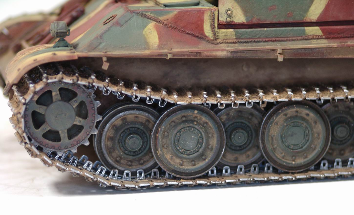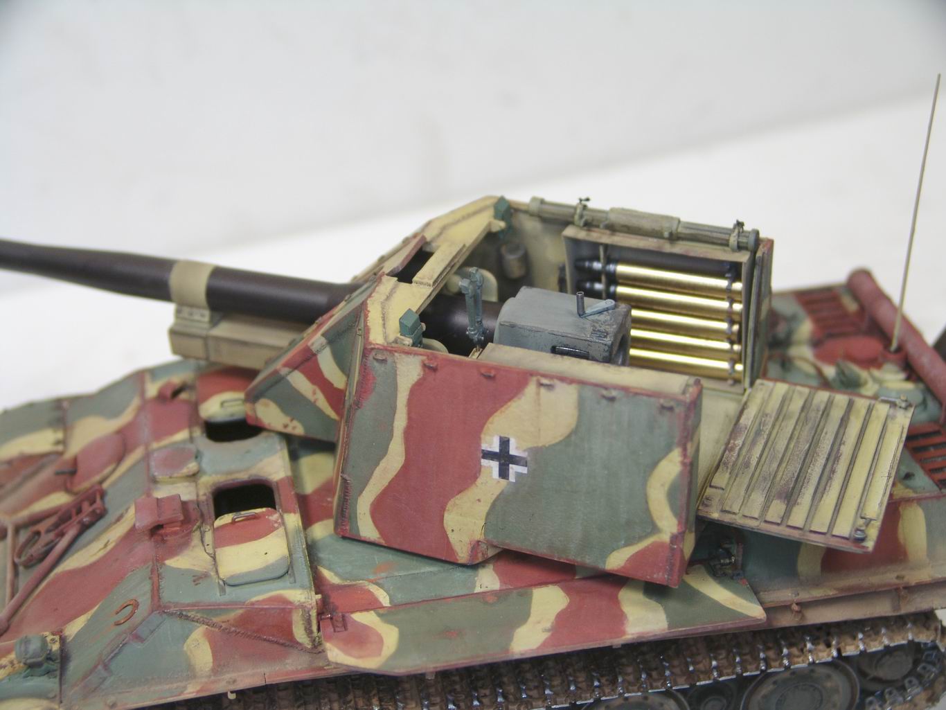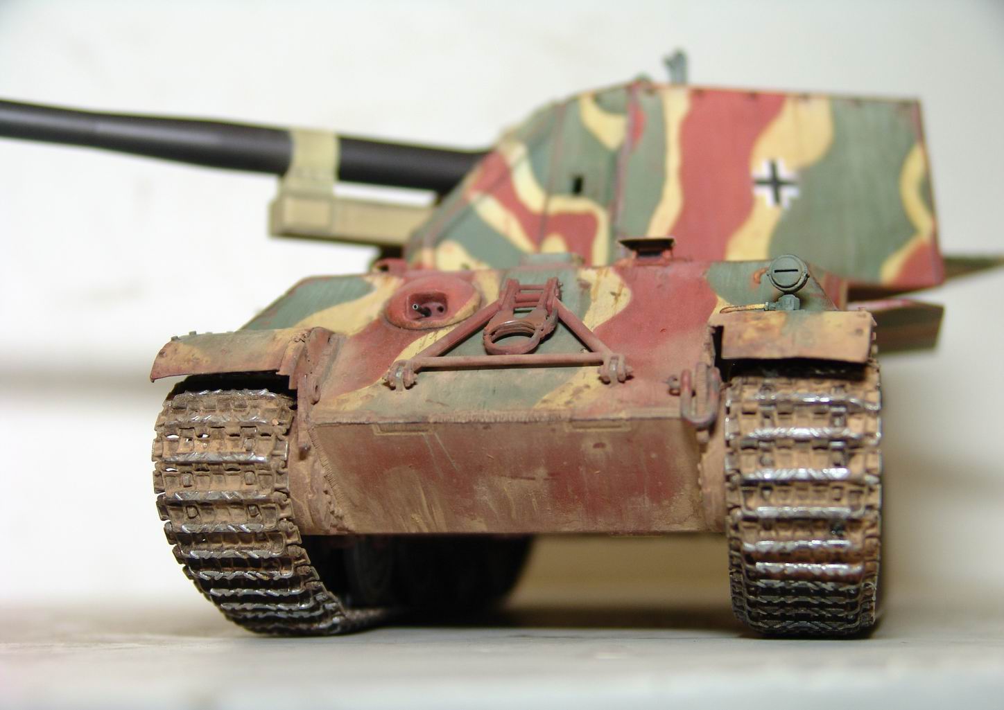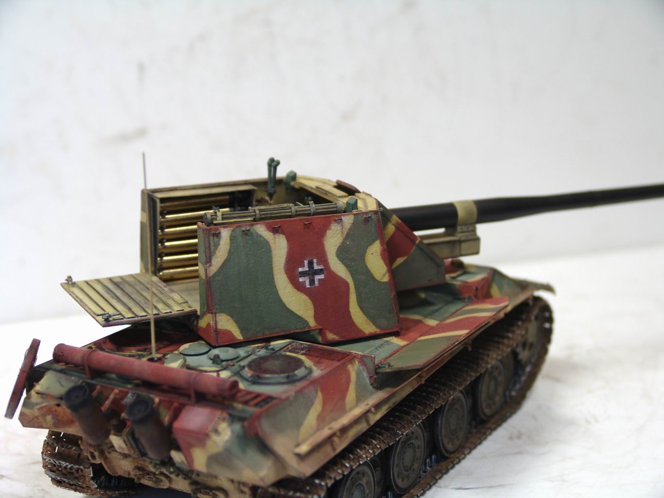 Выношу на обсуждение модель истребителя танков 128 мм PanzerkanoneGerat 5-1213 Reinmetall- Borsing, или другими словами Ягдпантера II. По данным известного исследователя немецкой бронетехники Вальтера Шпильбергера машина была разработана к середине 44 года на заводе Рейнметалл-Борзинг, но дальше проекта дело не пошло. Вместе с тем японцы из Armor Modelling утверждают, что один экземпляр был построен в конце 44 года и даже принял участие в боях с войсками союзников . Но так, как документальных фото пока не обнаружено, все это остается из серии домыслов и предположений . Но Пантера на мой взгляд очень интересная, поэтому за концепцию постройки модели взял версию японцев. J Ягдпантера построена на базе Пантеры G и вооружена 128 мм орудием K44L/55. Башня открытая, поворотная , с откидывающейся задней стенкой и бортами. Бронирование башни 40 мм борта и 70 мм лобовая часть.
