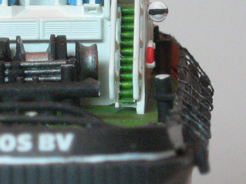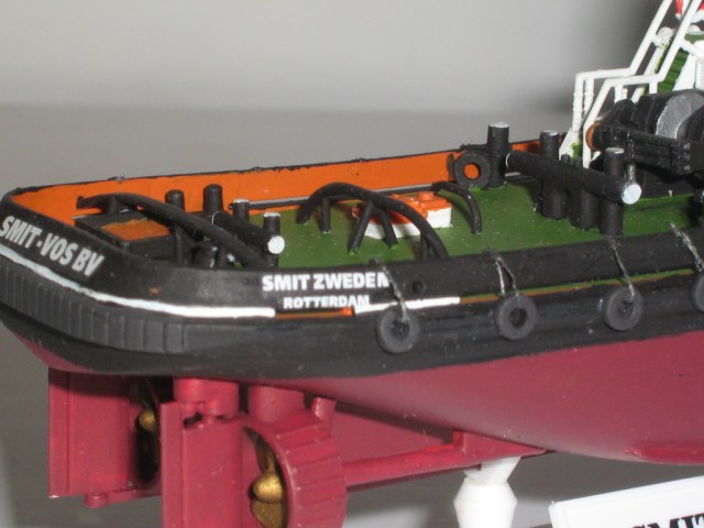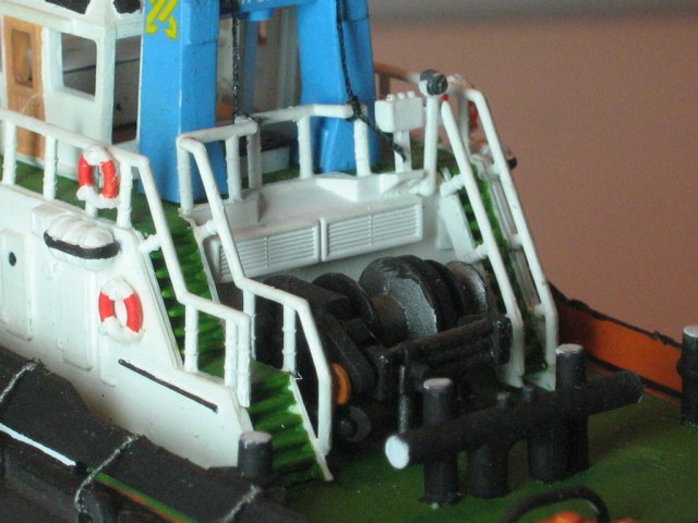 Дополнительная деталировка изготовлены тросы на которых держатся за бортом кранцы (автомобильные покрышки). тросы сделаны из нитки и покрашены вороненной сталью.