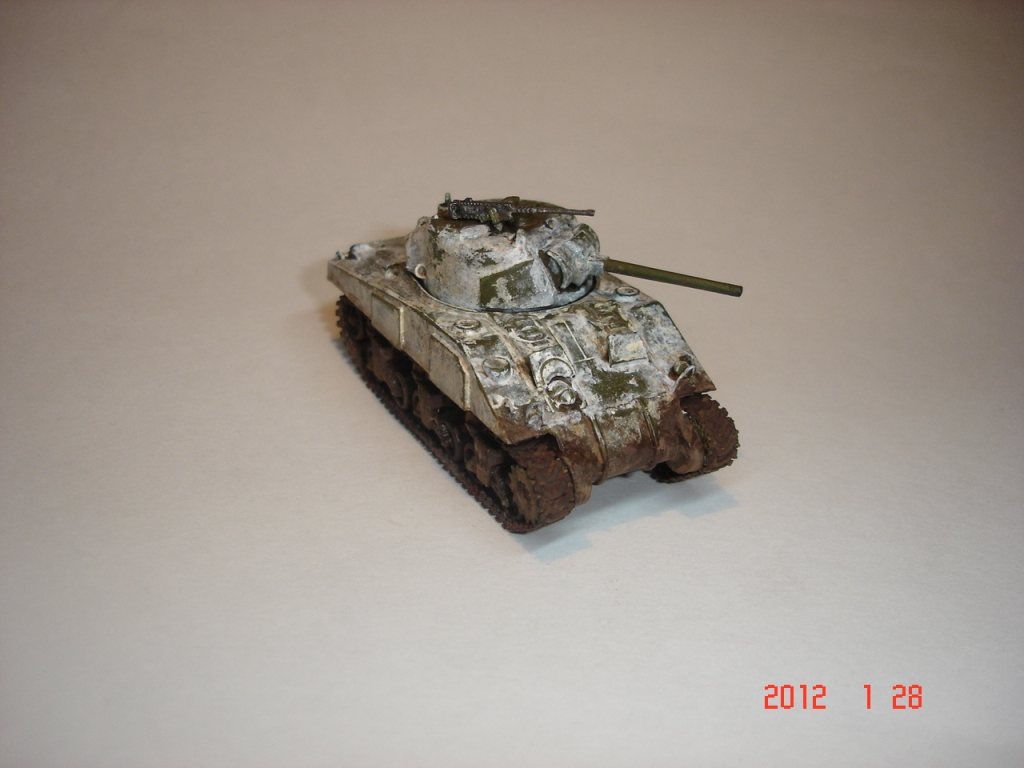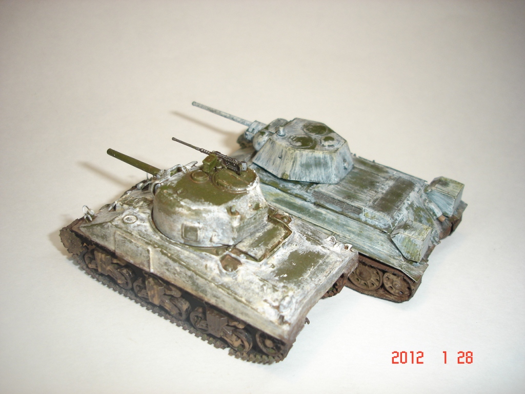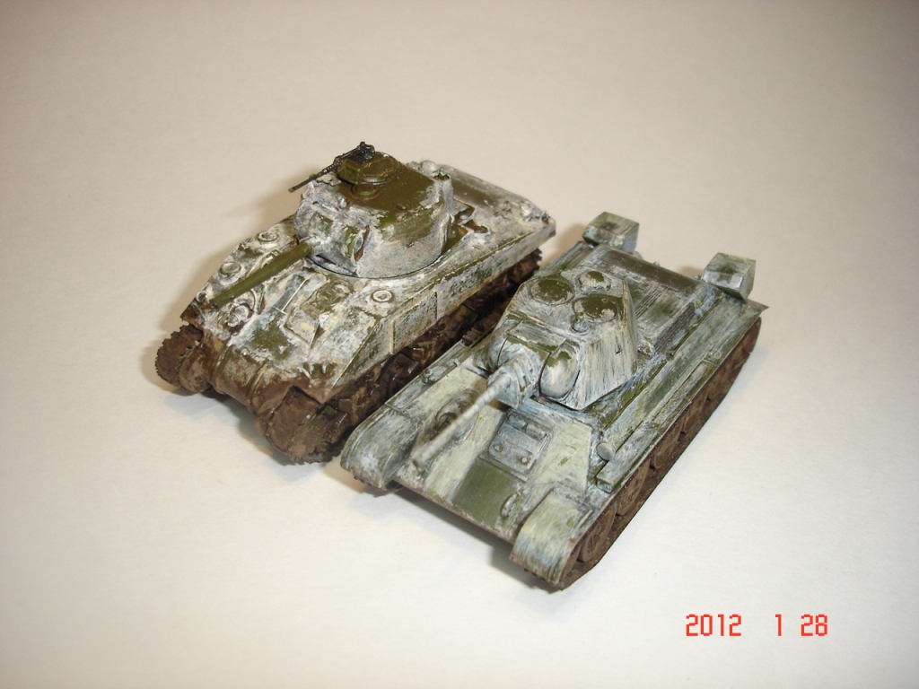 На 34-ке рядом, конечно получше зимний камо.На Шермане чистая зеленая крыша башни и пятно сзади рвет очень,смягчить переход надо (имхо).