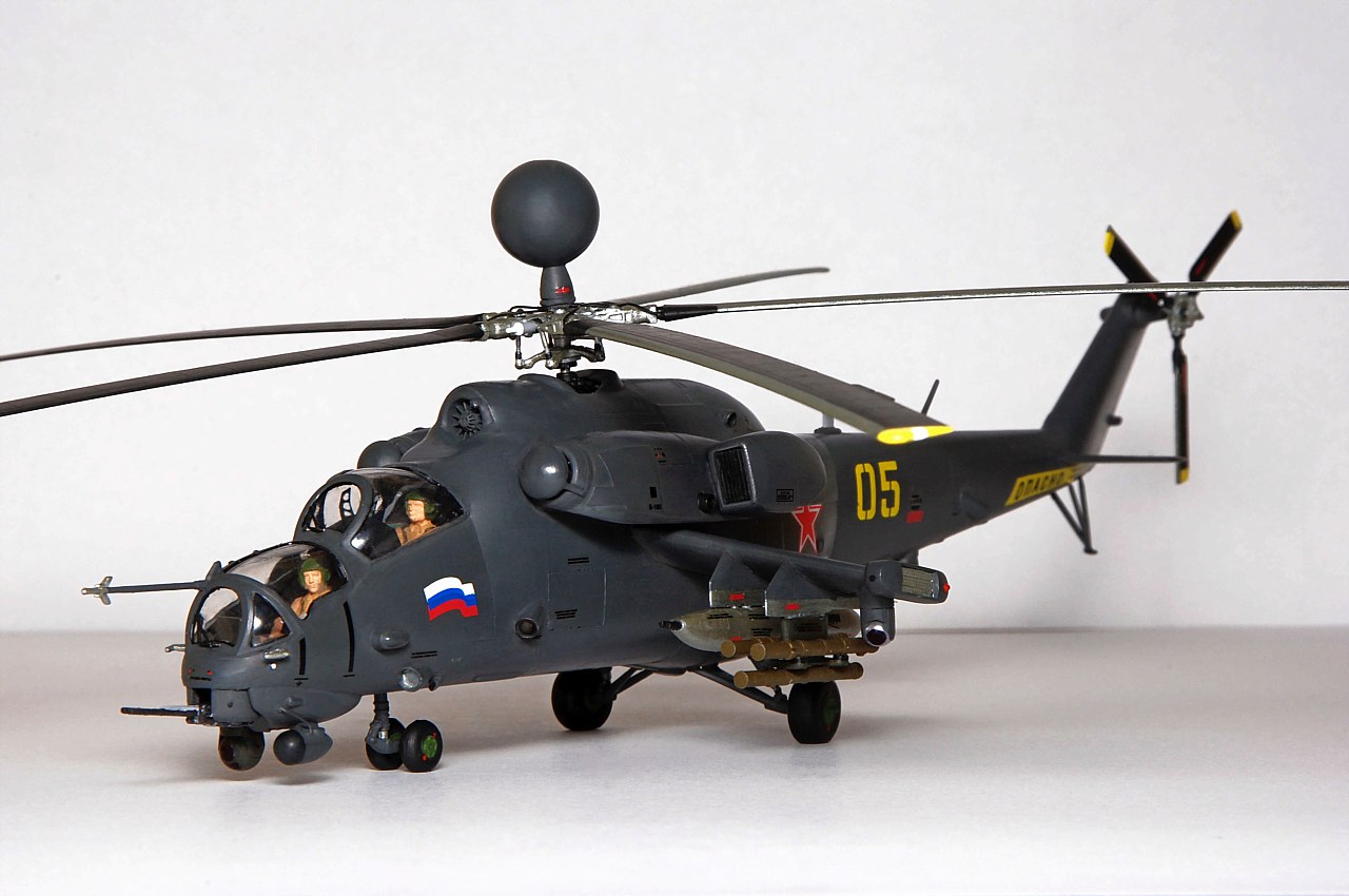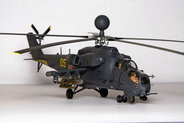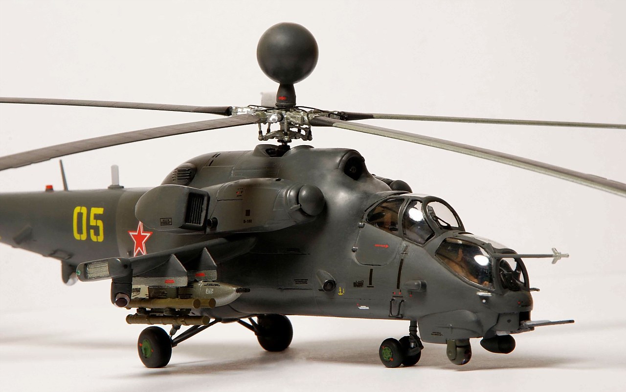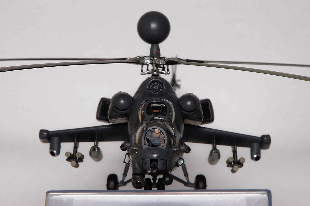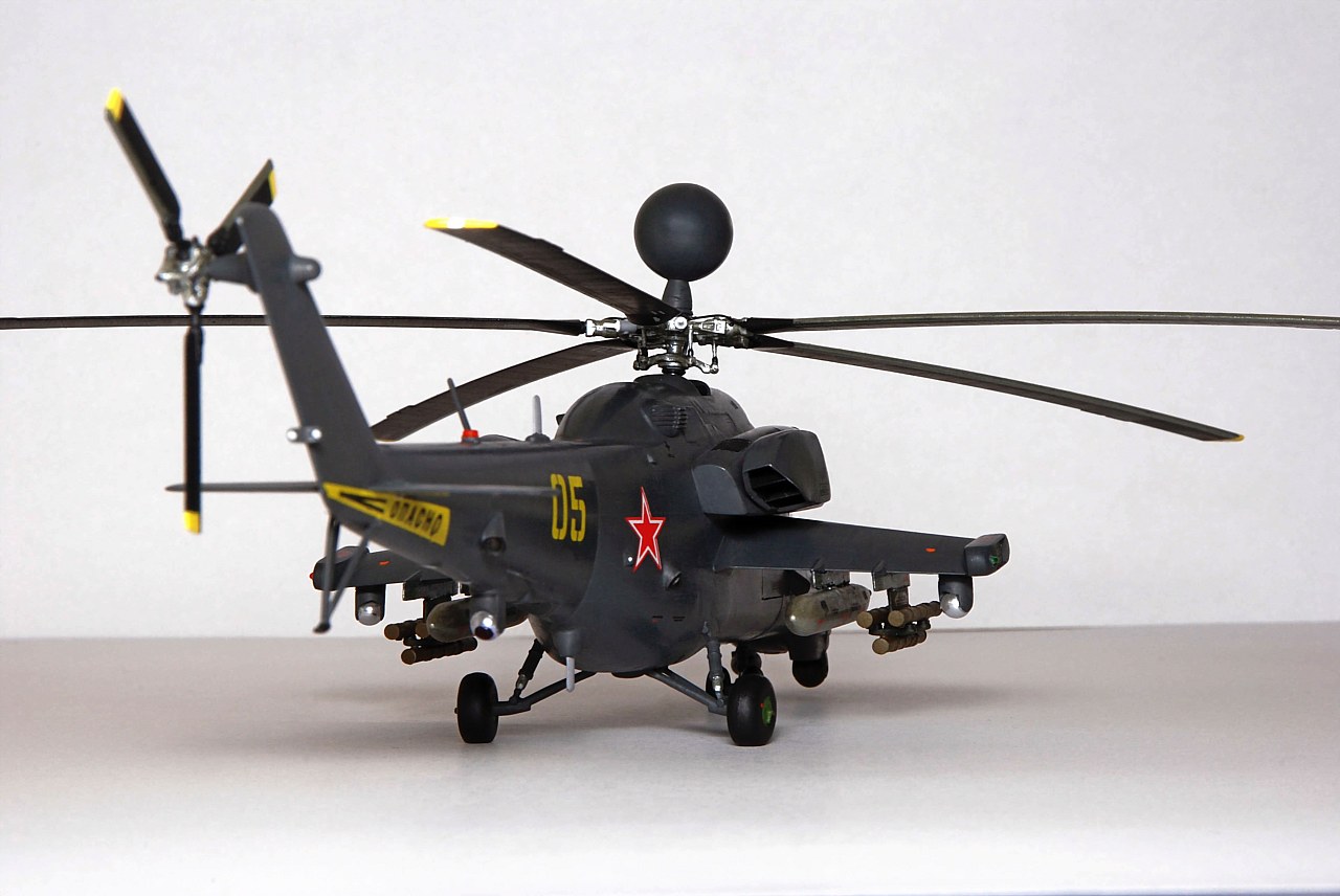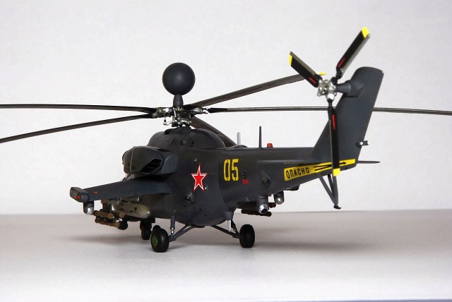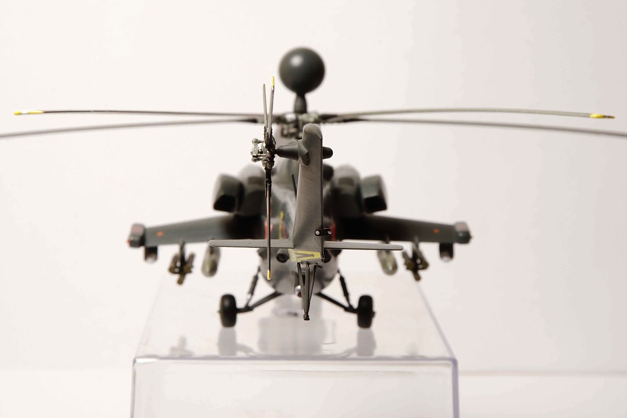 Фюзеляж уменьшен по длине и высоте. Самостоятельно изготовлены: гондолы двигателей, обзорно-прицельная станция, датчики бортового комплекса обороны, станции оптико-электронного подавления, надвтулочная радиолокационная станция, дворники, подножка, ПОС НВ и РВ. Изменены крылья вертолета, уменьшено количество узлов подвески вооружения, шасси сделаны неубираемыми, переделаны и вынесены на законцовки крыльев блоки ЛТЦ. Окраска производилась кистью красками Revell.