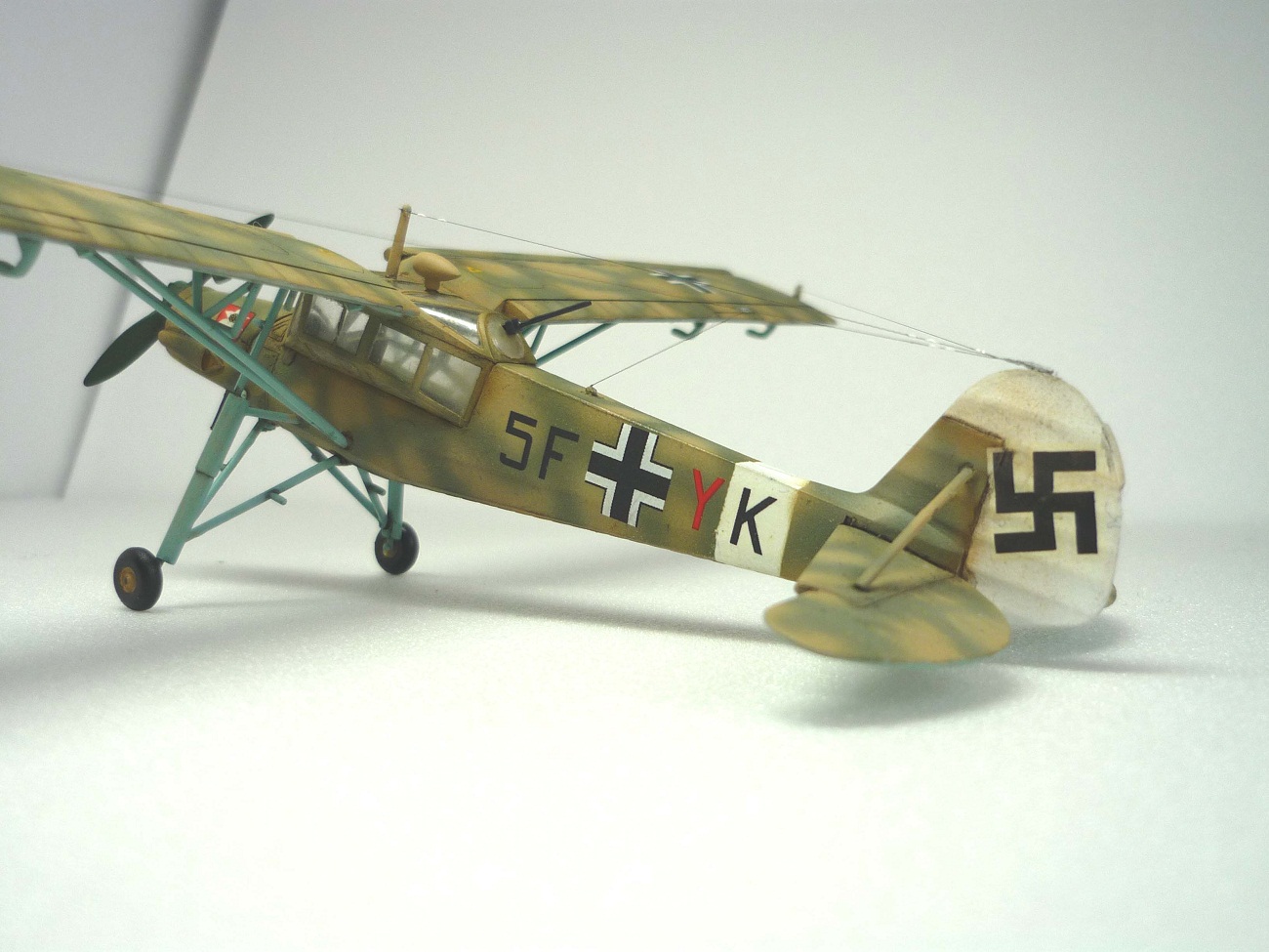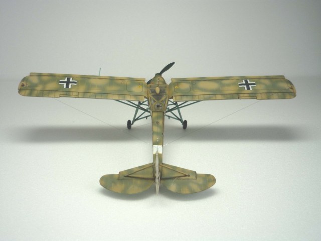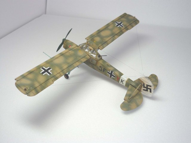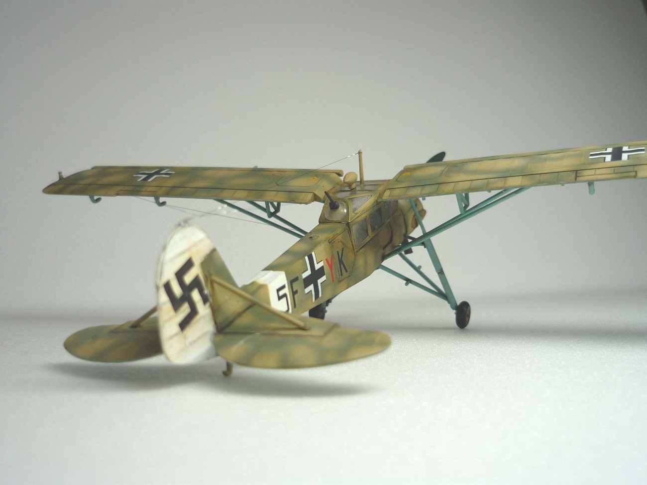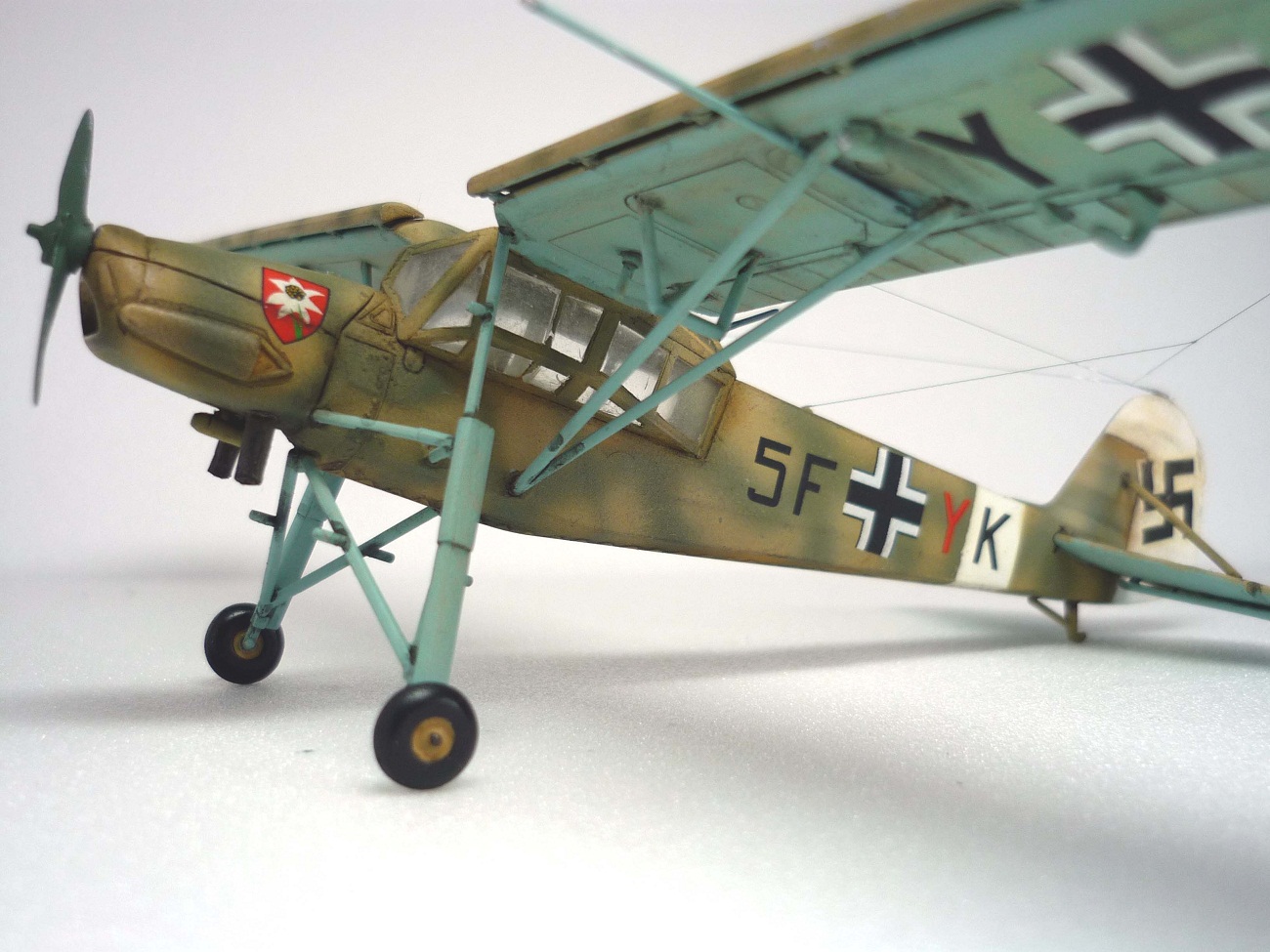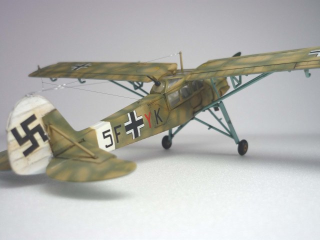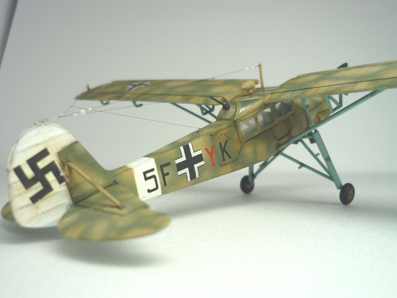 Доброго времени, Коллеги! Выставляю на ВАШ суд модель знаменитого немецкого Аиста! Собираемость кита неплохая..трудности возникли при сборке кабины. Шпаклевал только шов сверху фюзеляжа( Тамиевской шпаклевкой). Красил верх водорастворимым Аканом...низ акрил vallejo. Смывка акрил-звезда+фейри. Из доработок-выхлопные патрубки( из фольги самоклейки),антенны нить из бантика, пулемет и пито иглы,ну и капот обклеил фольгой . В наборе к сожалению не было свастики((((...в запасах нашел но мне кажется великовата....делать нечего..что было,то и оставил. Немного запачкал пастелью...немного сколов на предкрылках.....и финишное покрытие матовым лаком. Вот что в итоге и получилось.