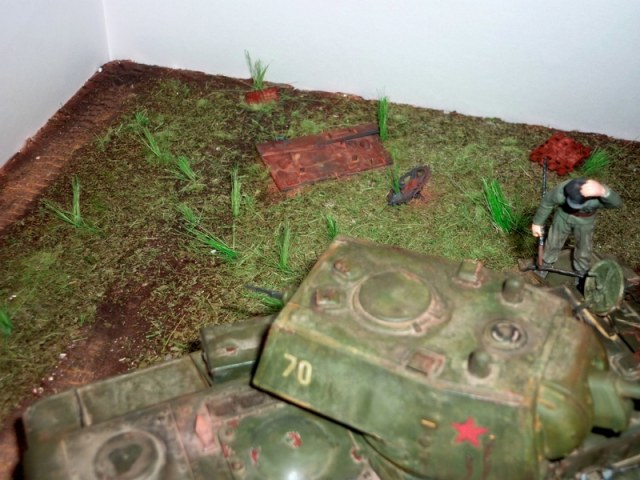 Доброго времени суток! Представляю на Ваш суд свою первую диораму. Делал для конкурса родителей в школу, поэтому чуть торопился(сроки поджимали). КВ1 от Звезды, Ганс из набора Пз4 от того же производителя. Основание- пенопласт, земля из шпаклёвки для гипсокартона, трава- сантехнический лён, кусты- кисточка. Красилось звёздовским акрилом, пыль- пастель. К критике отношусь адекватно- готов принять порцию табуреток.