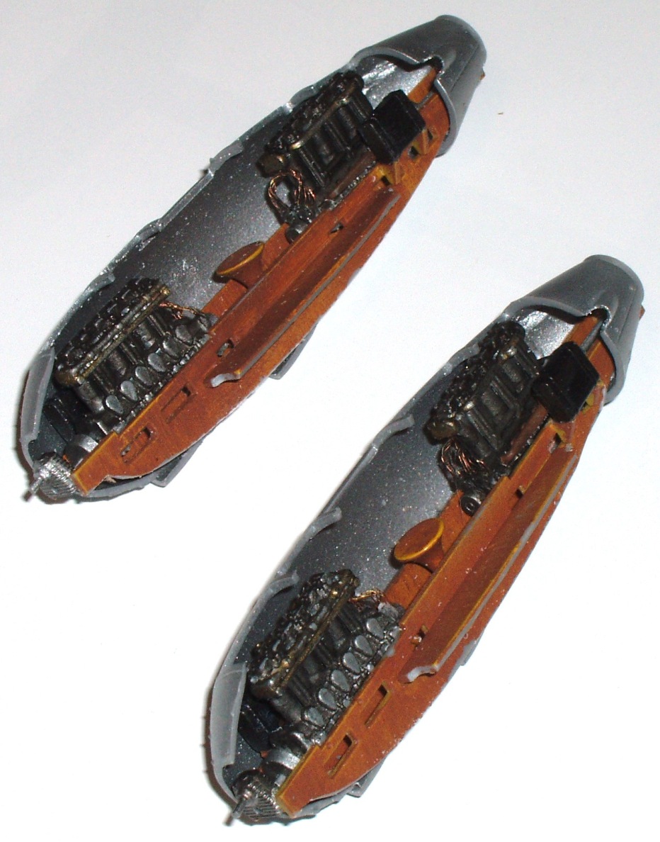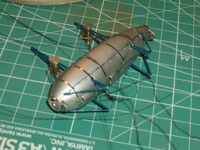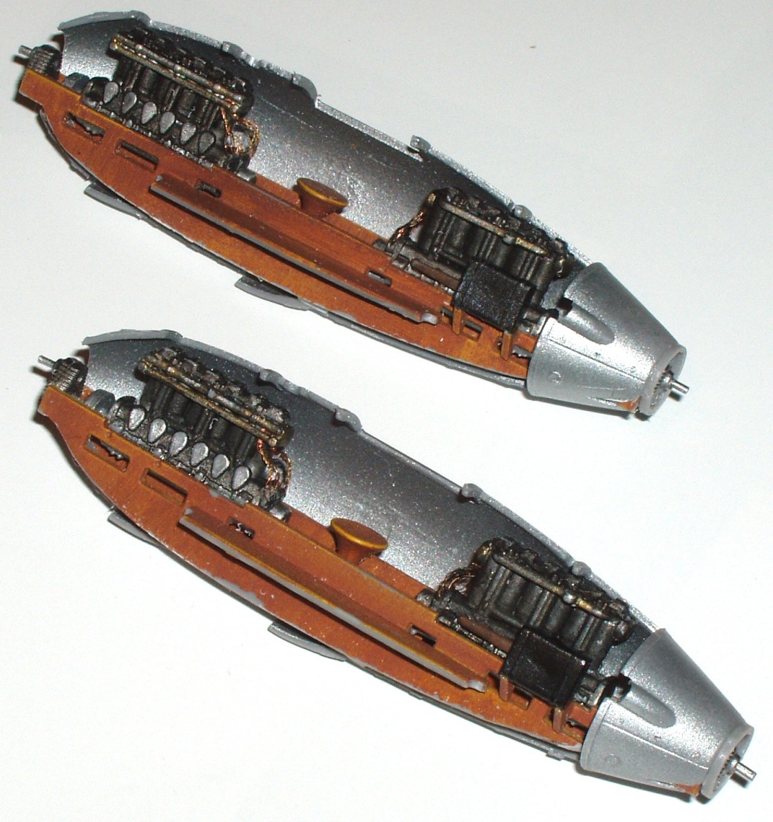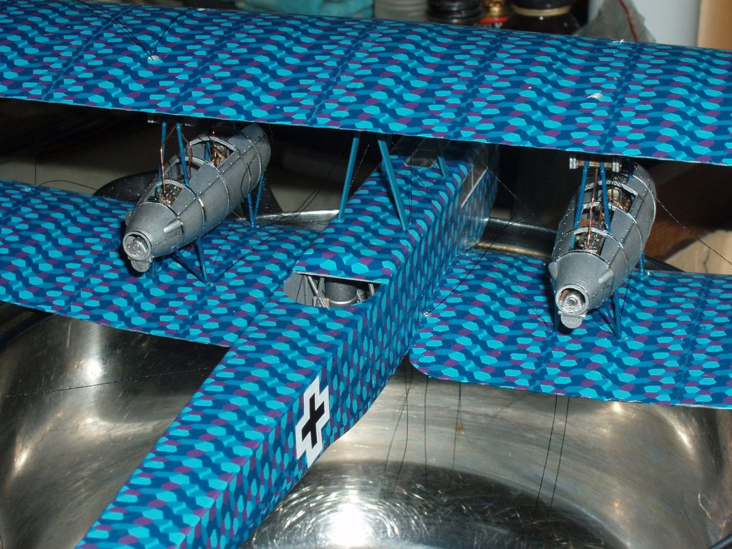 МОТОГОНДЛЫ принесли неприятный сюрприз, так как двигатели Maybach Mb.IVa устанавливались с редуктором, собрал их на мотораме согласно инструкции, но в саму гондолу они не лезли по высоте, кроме того, вал винта был выше центра мотогондолы, и винт с коком был смещён на 2-2,5 мм. Пришлось стачивать мотораму и дорабатывать редукторы по месту. Но на этом сложности не закончились: по инструкции половинки мотогондол предлагается собрать вместе со стойками, после чего зачистка шва крайне затруднена из-за торчащих тонких стоек, которые легко можно поломать. Потом были установлены водяные радиаторы. На лобовой части всех радиаторов присутствовали утяжины и отсутствовал рельеф. Утяжины были зашпаклёваны и сделан характерный пластинчатый рельеф.