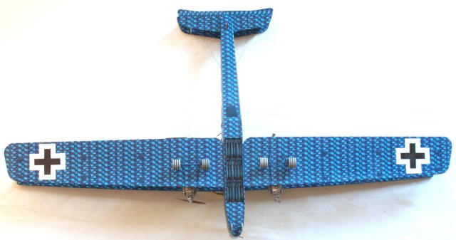 На ХВОСТОВОМ ОПЕРЕНЬЕ все по инструкции, только крепление нижних плоскостей стабилизатора я заменил на мед.иглы проходящие сквозь фюзеляж , так как побоялся ,что под воздействием растяжек бипланная коробка стабилизатора деформируется. Так-же не обозначены отверстия в фюзеляже под тросы управления и растяжки