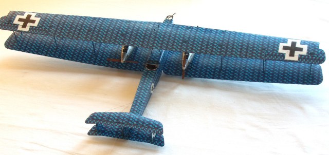 О «КОРОБКЕ» крыльев. Сборку осложнил, как и ожидалось, большой вес крыльев и их нежёсткость , а также слабые крыльевые стойки (рискну предположить, что производителю лучше -бы сделать крылья методом ваку, сложно в сборке, зато легче и более жёстская конструкция ,имхо). Поэтому отказался от привычного «чулка» для крыльевых растяжек и, впервые применил швейную нить (пр-во Германии, синтетика- полиэстер ( со слов продавщицы), удлинение до разрыва на 100 мм- 1мм). Крепёж- сквозь крыло. Каждая консоль протянута двумя продольными и двумя поперечными растяжками. Модель была вывешена на предполагаемые точки опор (шасси и костыль), затем установлены межкрыльевые стойки. Потом протянуты растяжки, в качестве грузов использовал бельевые прищепки ( удобнейшая вещь при сборке и растяжке моделей !). Выровняв бипланную коробку ( с помощью поперечны храстяжек) , зафиксировал тамиевским супержидким клеем стойки и растяжки. После высыхания залил самодельной шпаклёвкой отверстия на верхней и нижней плоскостях ,после высыхания зачистил и задул крышки узла крепления стоек. После этого модель можно брать и переворачивать без риска, что верхнее крыло отлетит.