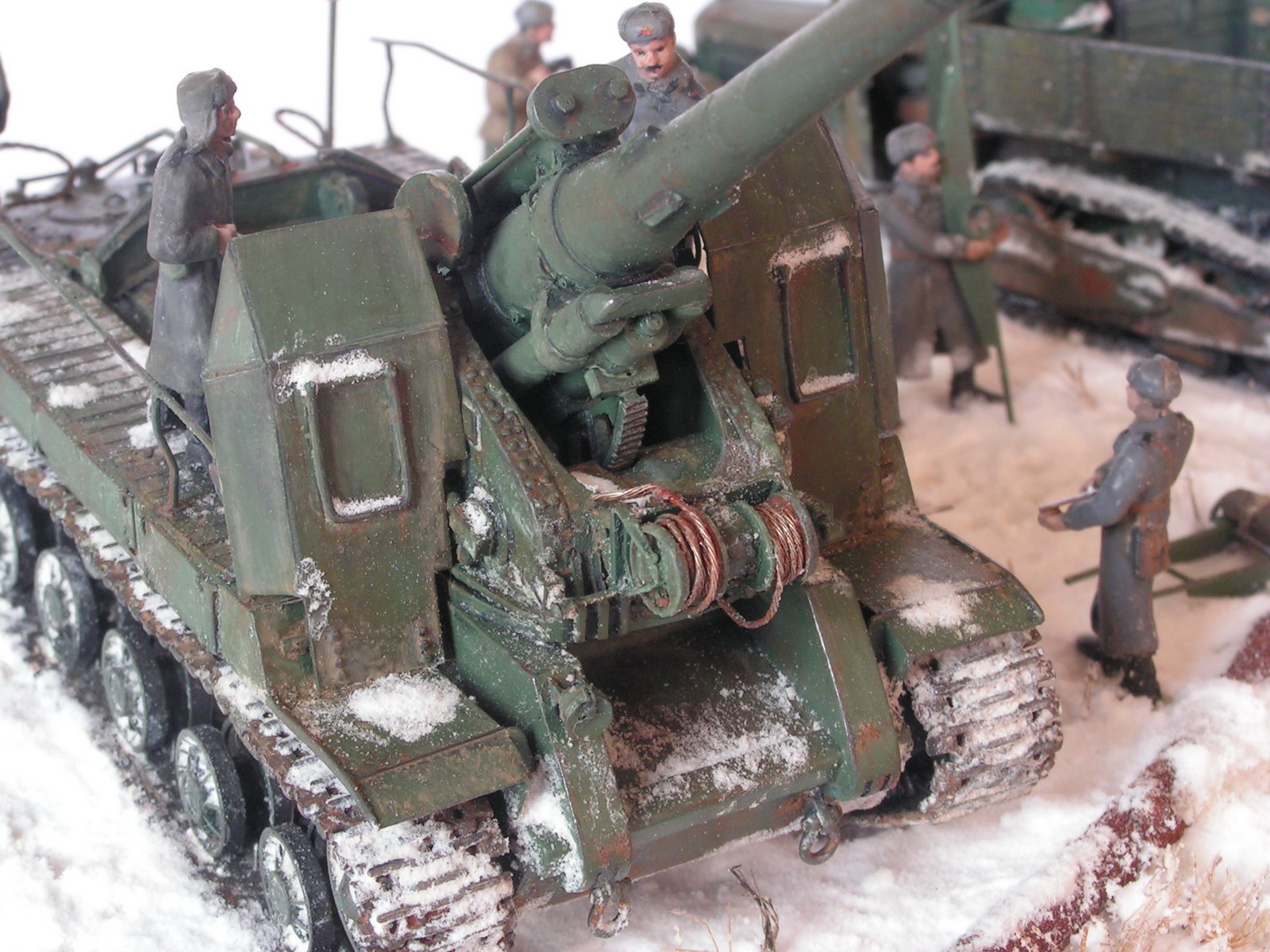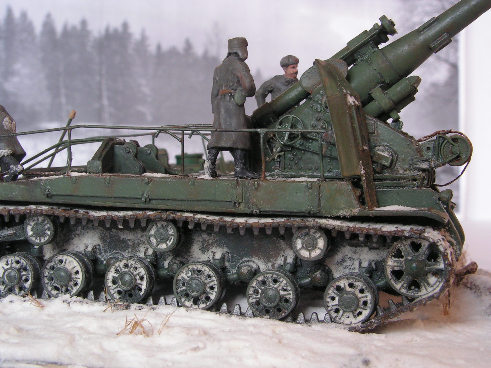Доработке подверглись катки,балансиры, немного траки (подточил ребра траков, сымитировал пальцы). Поняв невозможность сделать достоверно профиль гусеницы решил призвать на помощь снег, коим все и залепил.