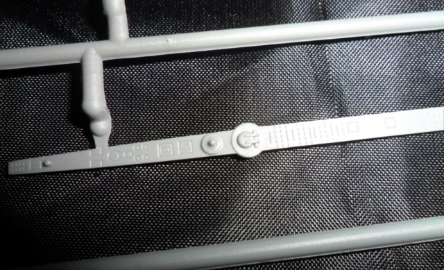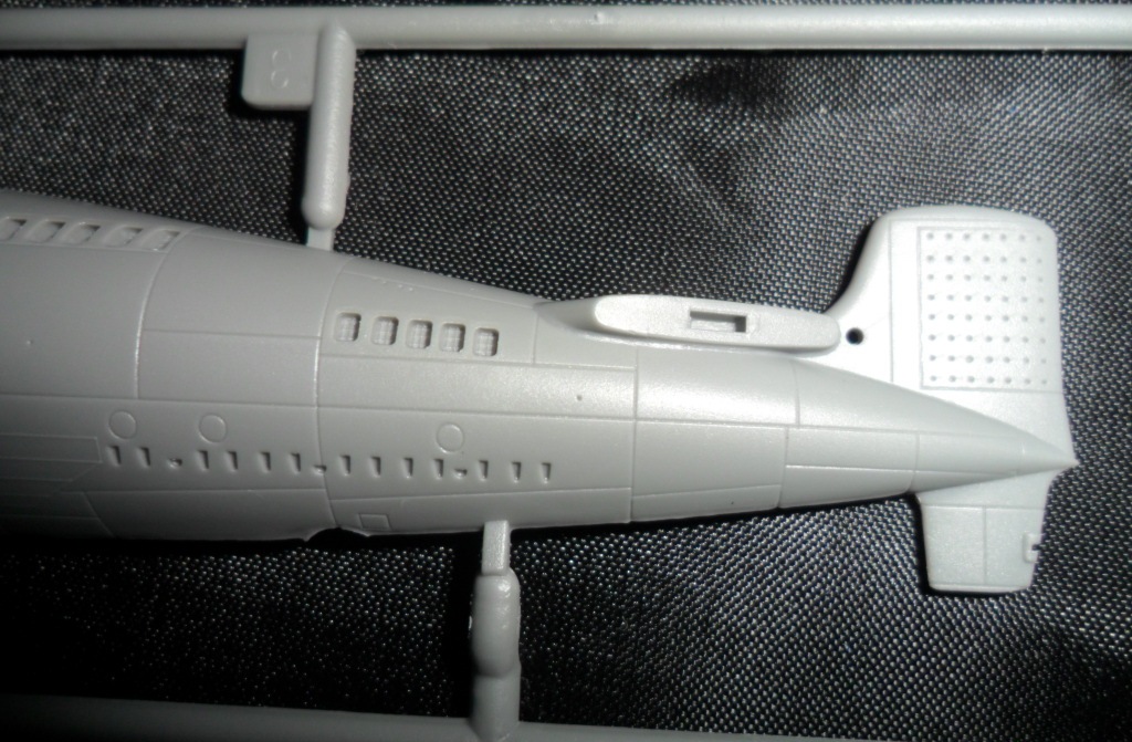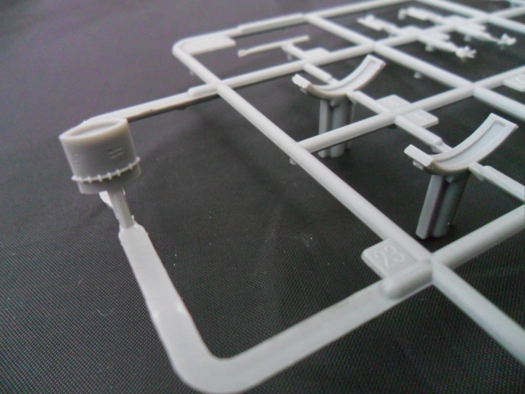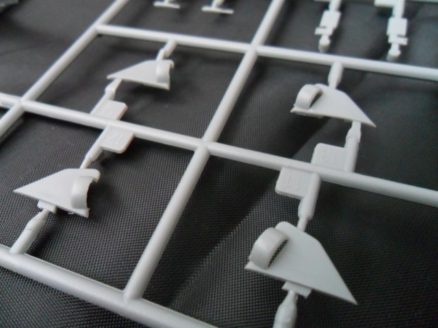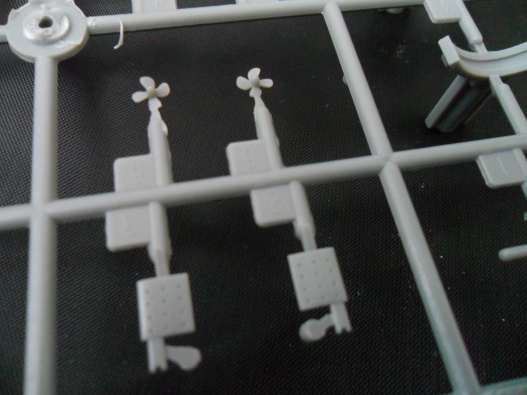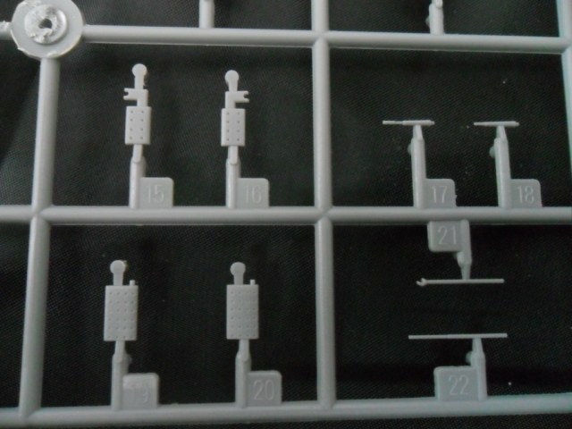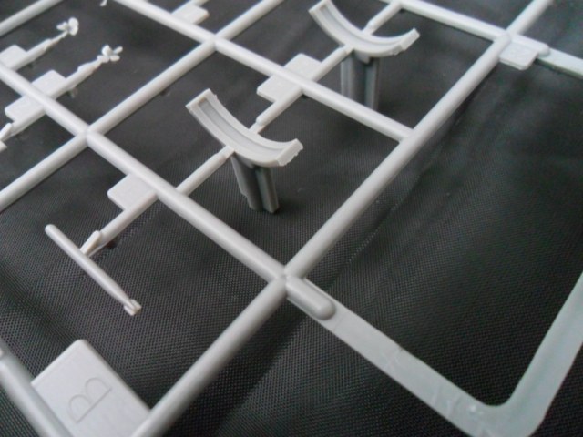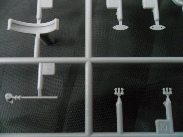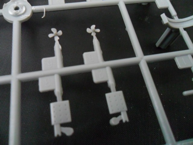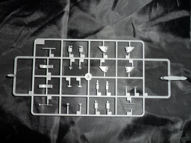 На следующей рамке расположились остальные детали модели: рули глубины, винты, рубка, ограждение ВУ, якоря, сами ВУ, стойки подставки и торпеда (нафига она нужна). Как мне показалось, на рубке довольно грубовато отлиты поручни, хотя, если не выделять это смывкой, проканает.