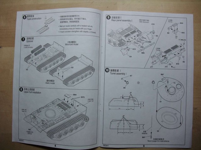 собирал такой,гусеницы качество хорошее но воплощение не ахти,и с башней еле разобрался,в итоге что то собрал но осталась еще приличная кучка деталей не понятного назначения.и почему то дается 2 пулемета и варианта 3 люка наводчика.самое интересное в данном наборе это минный трал.Автору удачи в сборке.