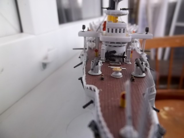 - не кривя душой скажу, мне понравился корпус. Учитывая, что он склеен из "обломков" особых следов этого я не заметил... Но вот палуба, ГОРДОСТЬ любого Командира корабля той эпохи, которую денно и нощно скоблили и драили матросы дабы ее дерево сверкало "яичным желтком", вдруг оказалась покрашенной в цвет деревянных полов "хрущевок"...