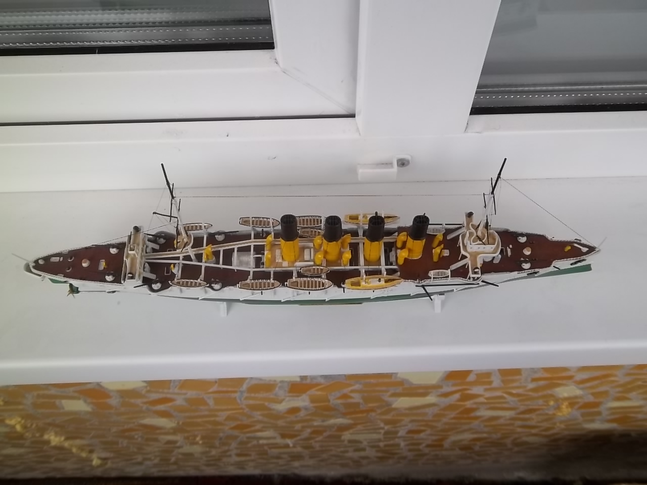 Начну с покраски. Понравилась. Хорошо, чисто, аккуратно, т.б кисть. Ток цвет палубы меня смущает. Ну по леерам и такелажу еще получишь порцию (не бум показывать пальцем). А вот сборка. Вот тут у меня недопонимание. Нет, нет, никаких больших огрехов нет, т.б история с корпусом....ну прям як в жизни, и респект за то, шо корабль всётаки вышел на рейд, и видно, что корпус хорошо восстановлен. Но на нём шо, выдохся? Мелочевка не ах: и шовчики и стыки необработанные есть, пара следов от литника есть не совсем хорошо обработанные, но эт всё видно ток в близи, канешн. Но орудийные лафеты..... Это, прости, жесть полная. Я не о форме, а о сборке. Мало того шо некоторые с перекосом собраны, так стыки половин просто ужас. Имхо вывод- модель сейчас оч даж не плохо смотрится, но просто требует "Доработай меня, а?! Я ведь лучше буду!". Но эт маё имхо.