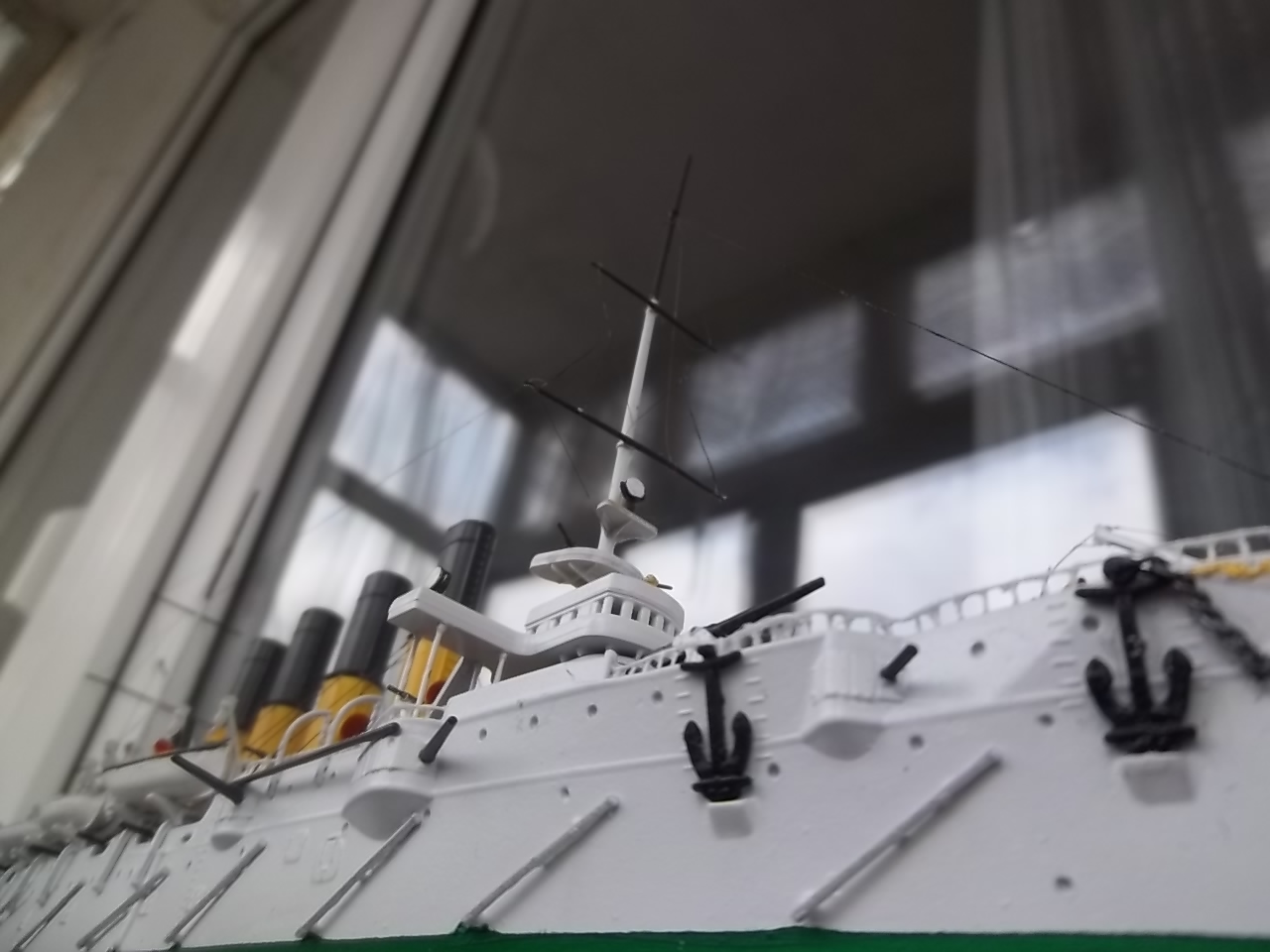 - такелаж.... Ох уж эти мои любимые "ниточки"... :-) Уже был готов поставить автору за него пятерку ибо его толщина подобрана (ИМХО) вполне "органично". О достоверности говорить не буду, ибо модель "по мотивам"... Но увидев на фото 8 (носовой штаг) и фото 10 ("ниточка", соединяющая первую и вторую дымовые трубы) какие то "узелки" очень расстроился.