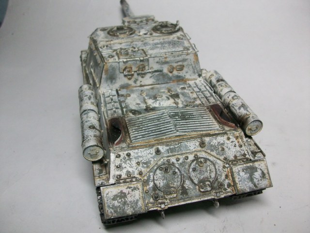 Зимний камуфляж выбран по причине неудачной грунтовки.Использовал технологию лака для волос.Заменил решётки МТО,поручни,обручи и ручки на баках,передние крылья.Гусеницы явно не удались,использовал из набора.Окраска акрилом АКАН,тонировка маслом.