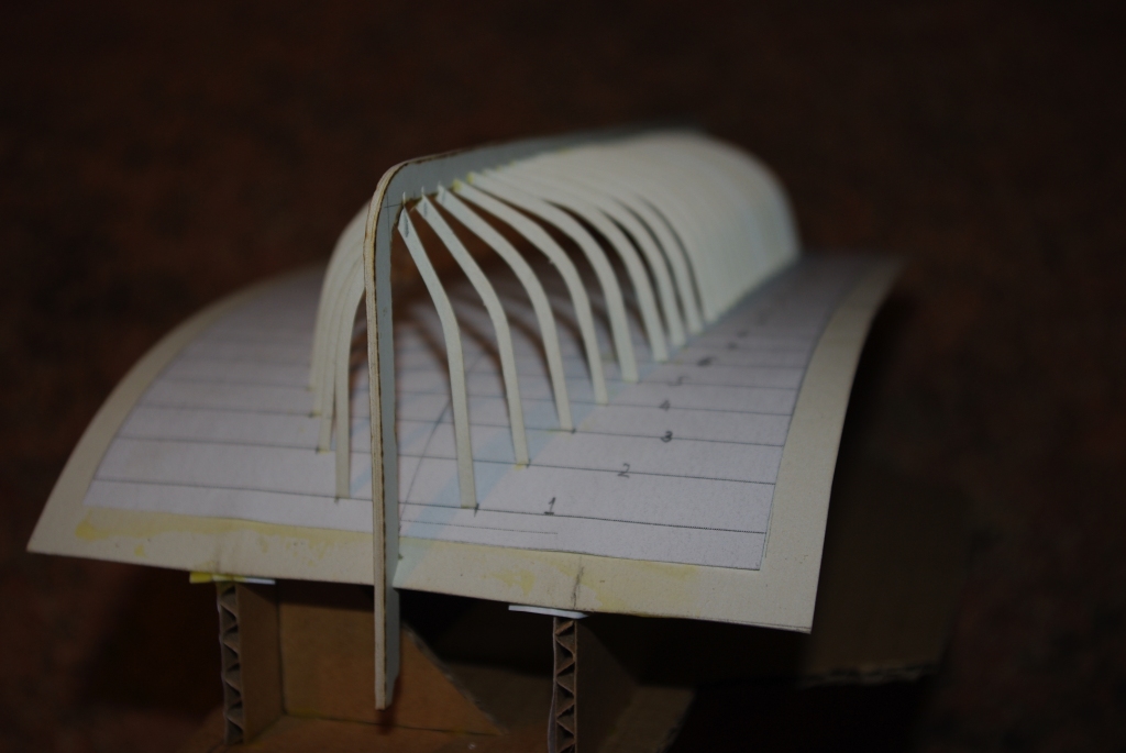 На будущее. Чтобы не было пролежней-провалов, нужно до начала обшивки проверить обводы с помощью рейки шпона. Приложить ее к штевням и немного как-бы растянуть в продольном направлении. В идеале рейка должна лежать на всех шпангоутах. Сразу будут видны "оторванные" шпангоуты и угловатые обводы.