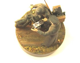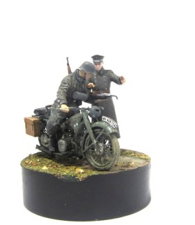 Очень не аккуратно. Грязновато покрашено. Офицер без погон, в шинели и фуражке непонятного цвета, воротник должен быть черно-зеленым, те же косяки по солдату (?) на мотоцикле.