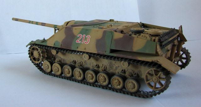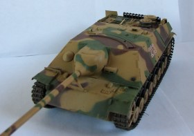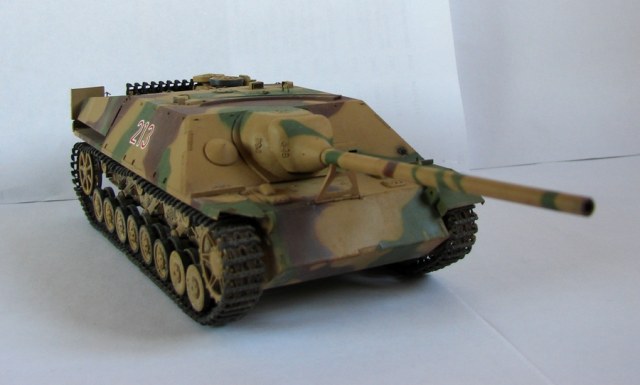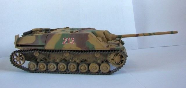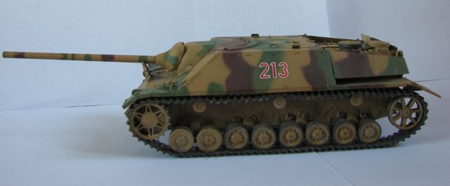 Попробую ответить всем сразу. Фотографий по которым можно ,что-то рассмотреть мало. Так как у меня нет фотоаппарата. Иногда случается вот и фотографирую. Если интересуют какие-то узлы и фигуры, в следующий выходной, попробую кое-что предпринять в этом направлении. Машина выпуска октября-ноября 1944 года. Была задумана маленькая диорама. Сюжет ясен по фото. Но так случилось, что эту работу пришлось отложить на неопределенное время. Потому машина немного не доработана, не хватает кое-что из аксессуаров, основания и др. мелочи. Естественно потребуется приложить еще руки к отделке. Так же, необходимо заменить опорные катки. Прицел решил не ставить. Крыша рубки была уже приклеена когда я вспомнил про панораму. Допустим ее убрали. Зубчатый венец правого ведущего новый, старый вышел из строя. Поэтому на зубцах краска. И 3 трака заменены из запаса. Гусянка до конца еще не соединена. На фото видно не обрезанный палец. Запасной цельнометаллический трак можно заменить а можно и оставить. Действительно на войне всякое бывает. Еще несколько фото