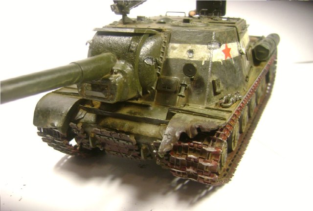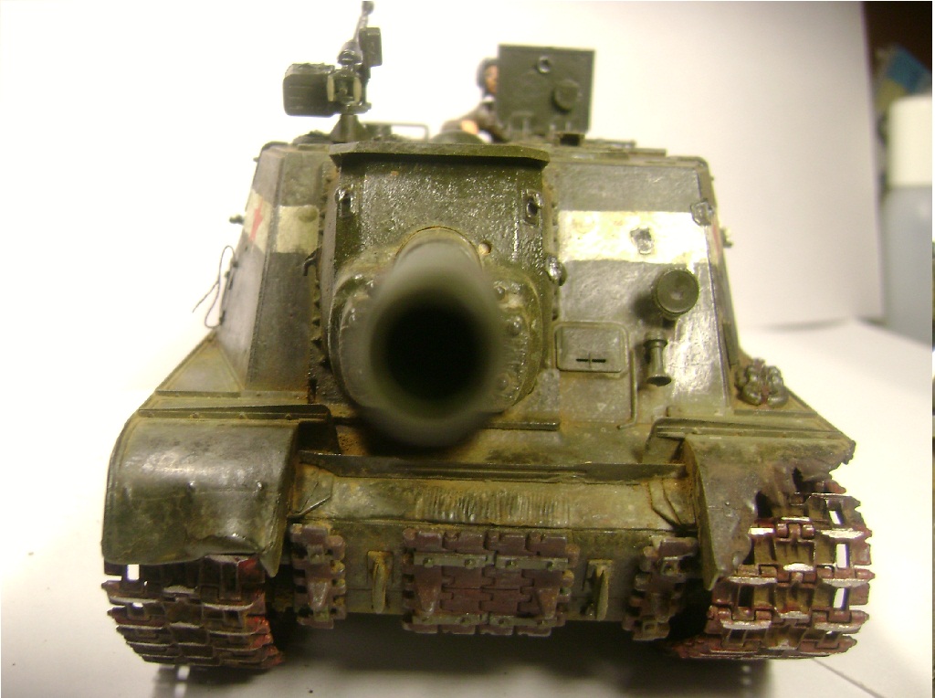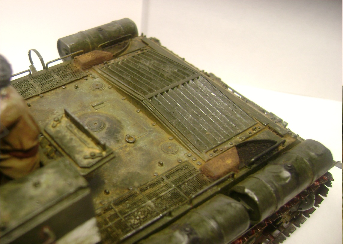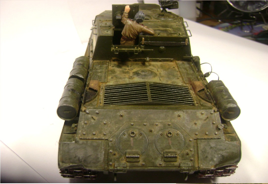 Самоход оставил хорошее впечатление. Очень не естественно выглядят "оплавленные" пластмассовые закрылки. Вряд ли металл мог принять такую форму. И уберите фигурку (или доработайте) -на руках незачищенный шов, пальцы не прорезаны, руки висят в воздухе,а не держатся за люк .