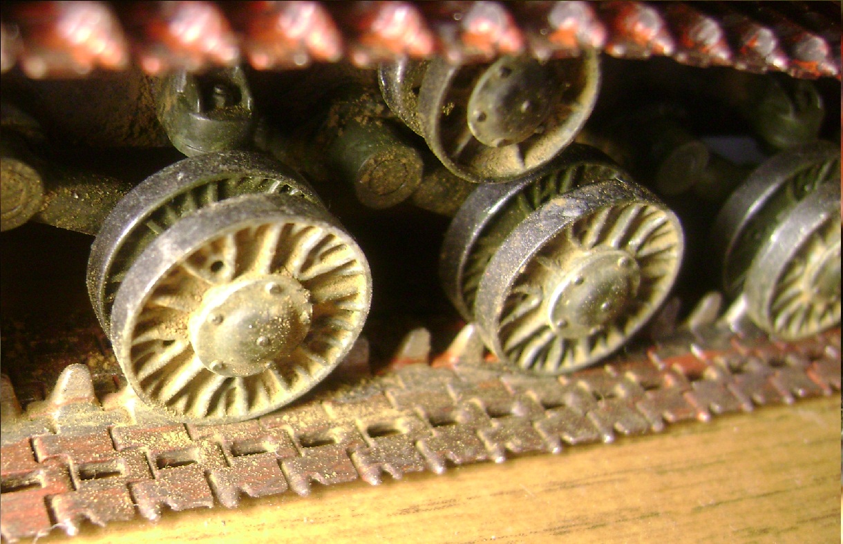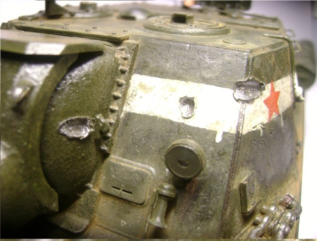 Красил кистью, акрилом Тамия и чуть-чуть Звезда, траки фриул, немного травления, пигменты Валеджо, применял простой карандаш и порошок активированного угля. Пытался имитировать непробития и рекошеты на рубке. Белую полосу на рубке рисовал кистью, хотя производителем была предложена декаль. Погрел на огне баки и крылья (не оч удачно, т.к. видно толщину пластика). Из двух предложенных фигурок танкистов решил посадить лишь одного - заряжающего.