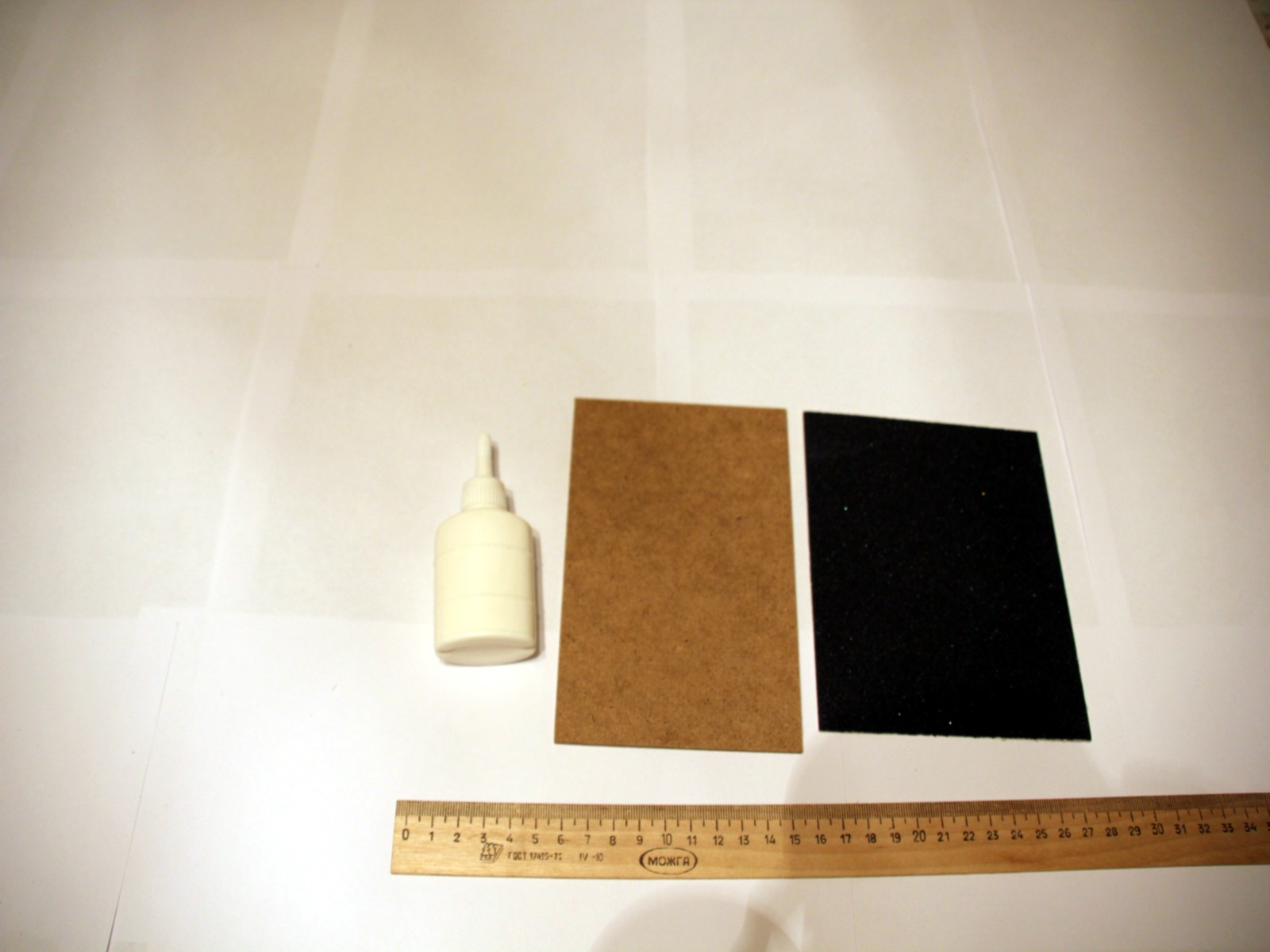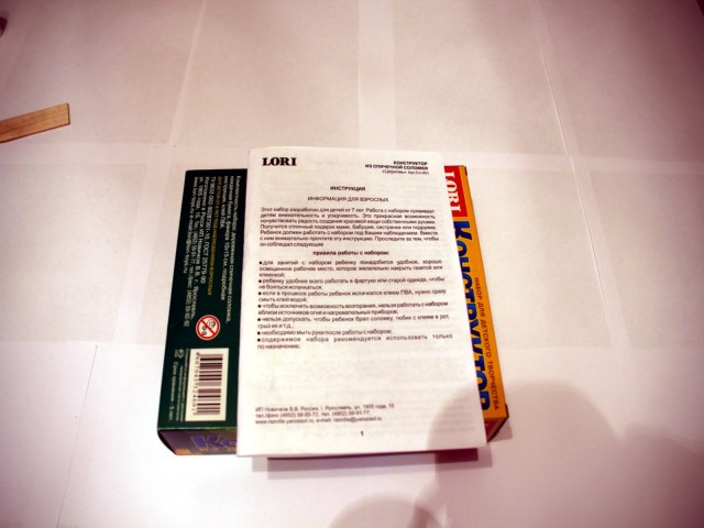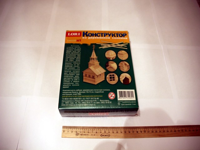 Внутри коробки инструкция, пакет со спичечной соломкой, обрезок оргалита 10 х 15 см, кусок шкурки, пузырек клея ПВА.