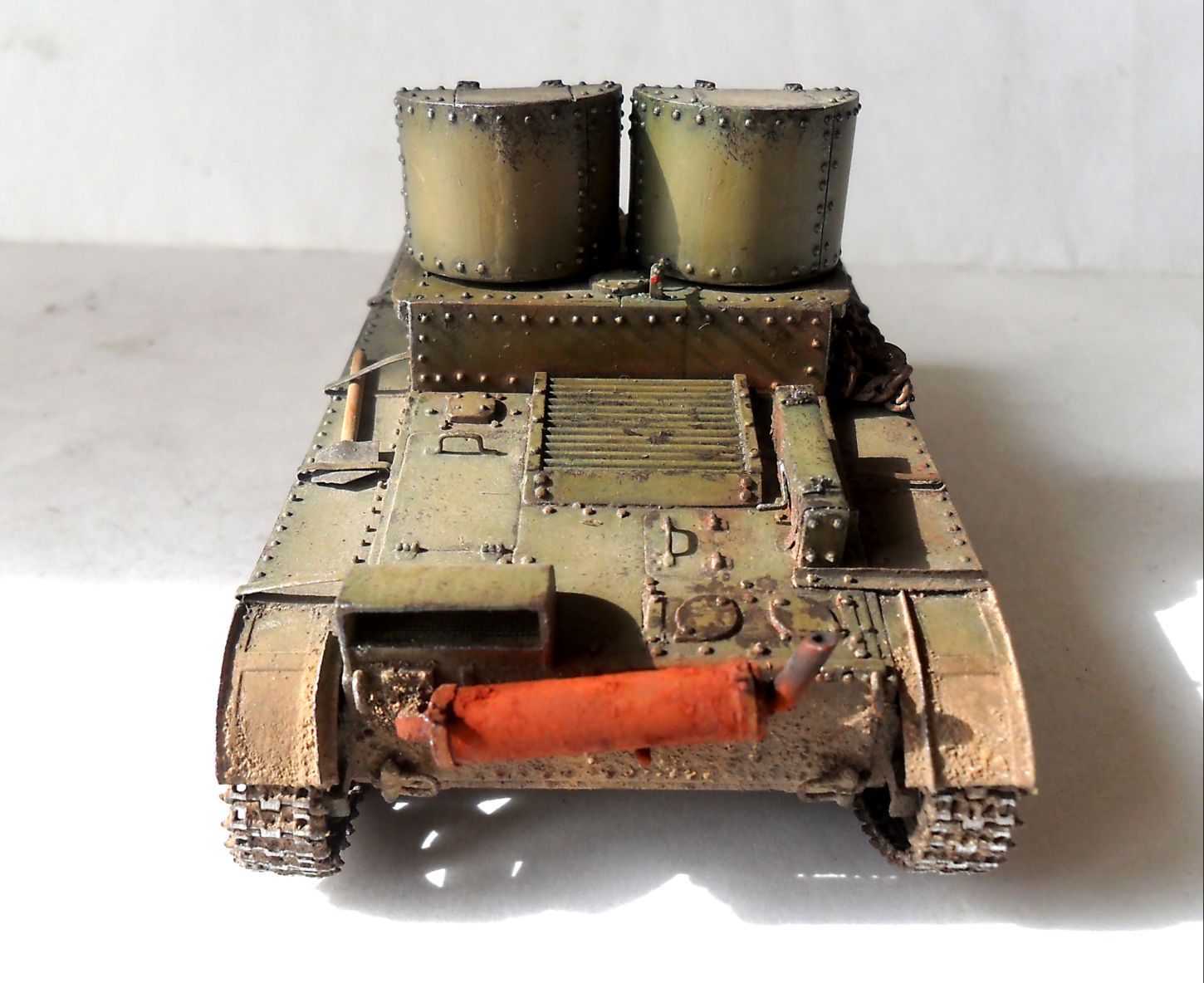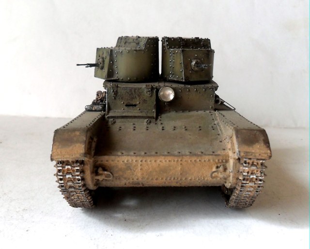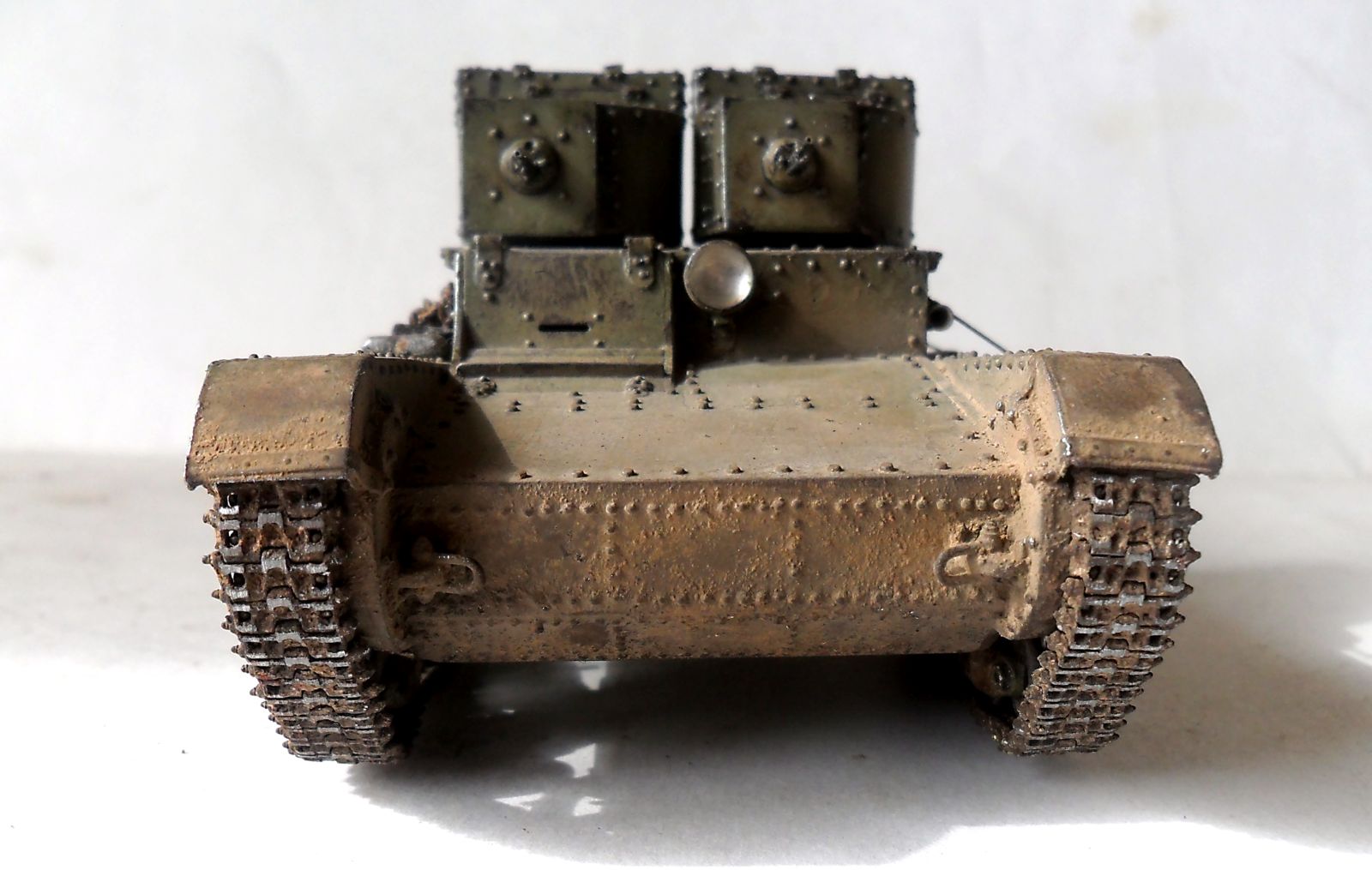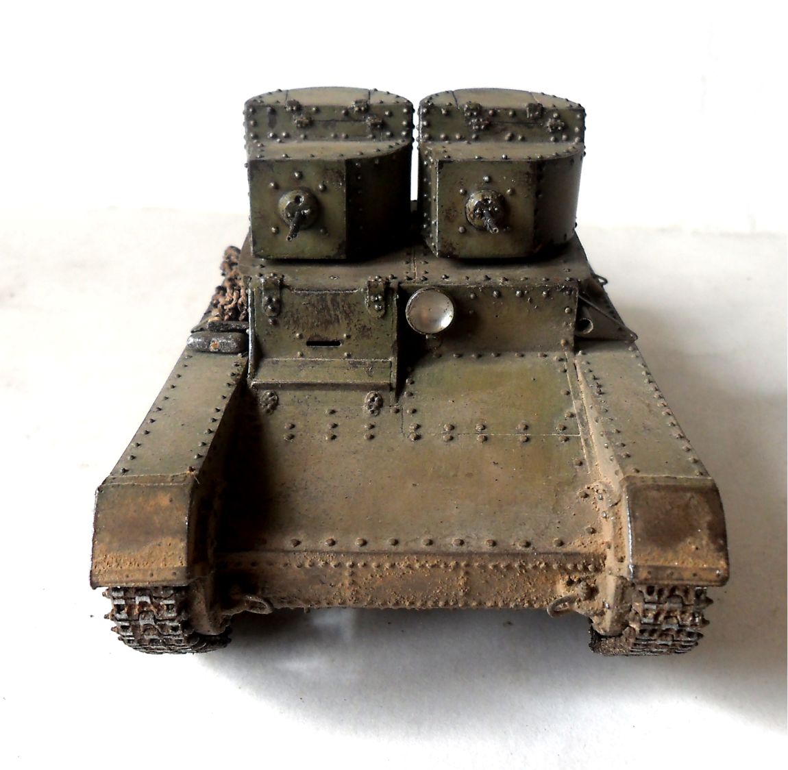 Алексей, про клепки на башнях: по количеству их даже чуток меньше (по окружности), а вот с типоразмером чуть-чуть промахнулся, в реале на башнях клепки на размер меньше, чем на корпусе, у меня все одинаковы. На двухбашенных и первых пушечных Т-26 фары стояли как у меня без всякого кожуха...