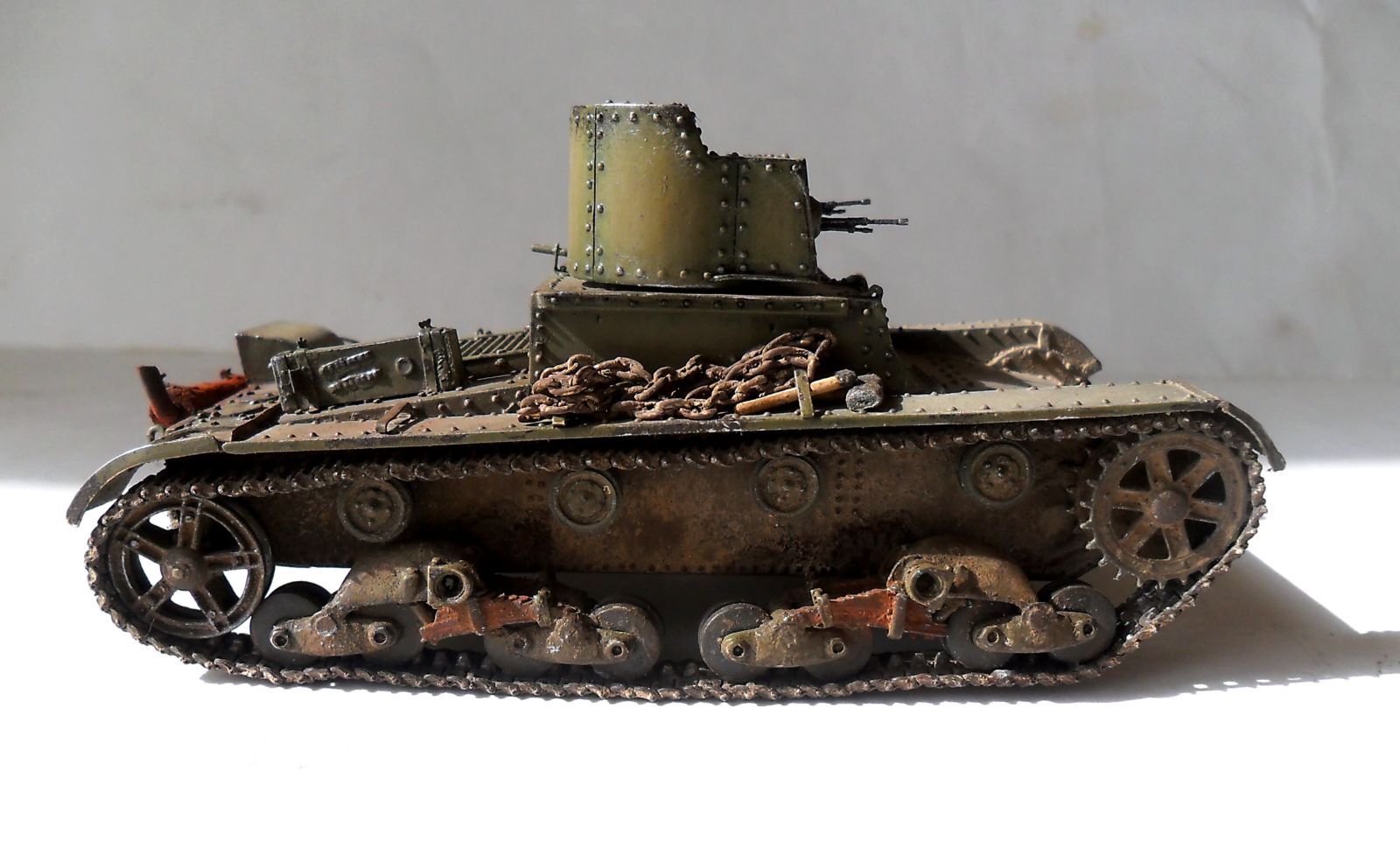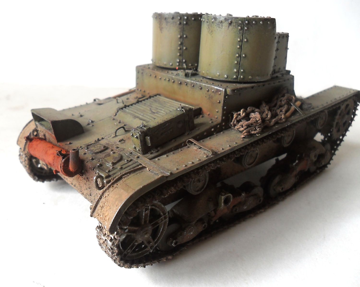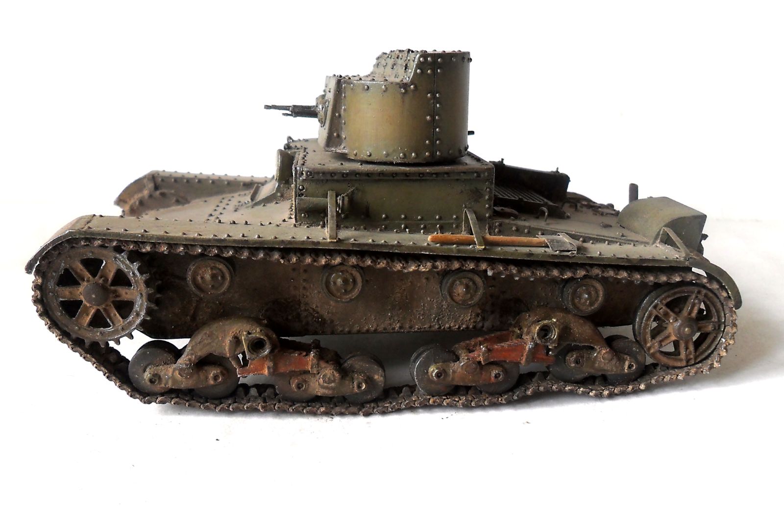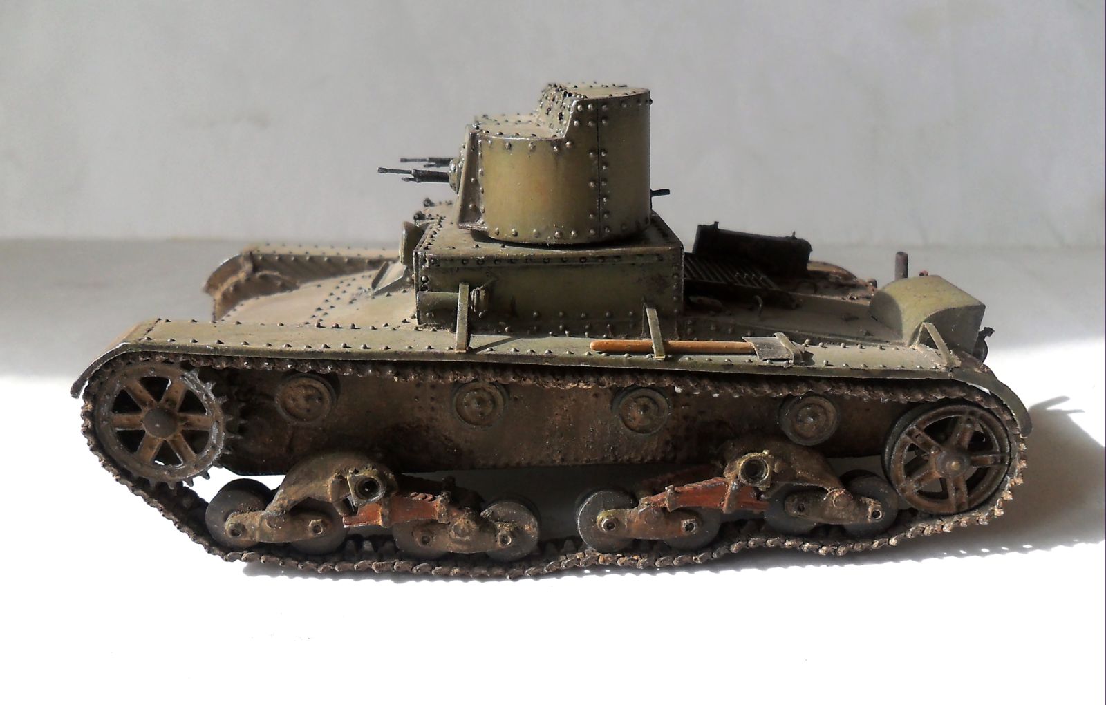 ...Не знаю как кому,мне бросились в газа клёпки на башнях.Их так много и так часто...Ещё увидел,что кожуха на фаре нет.А в основном...очень понравился Ваш танк.