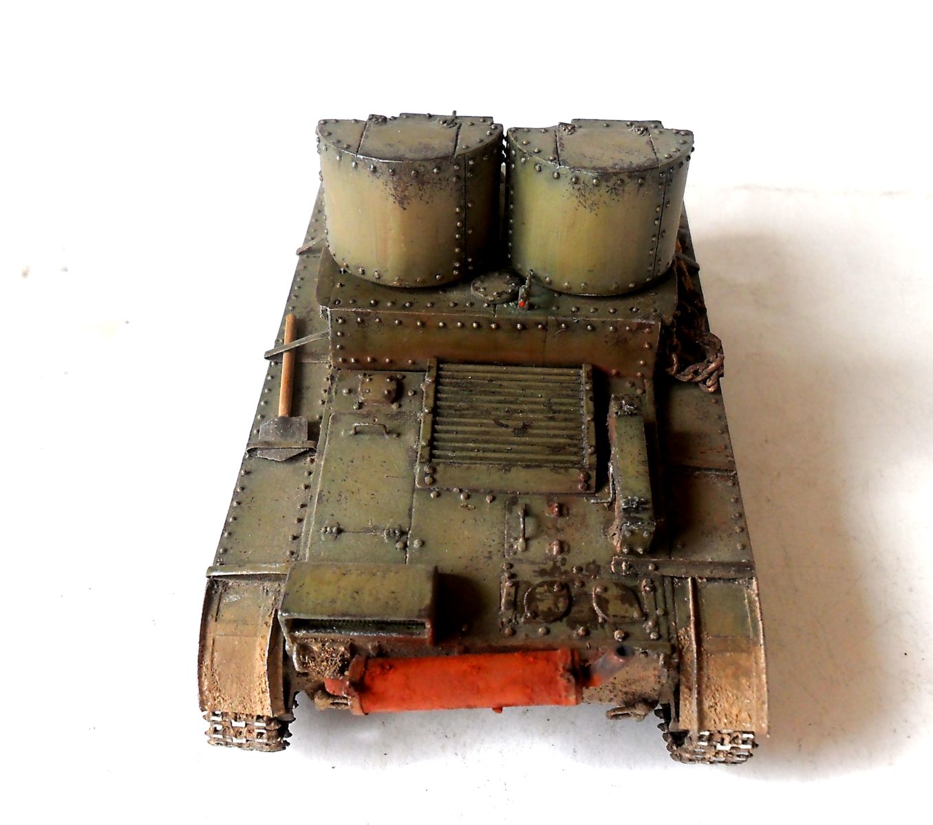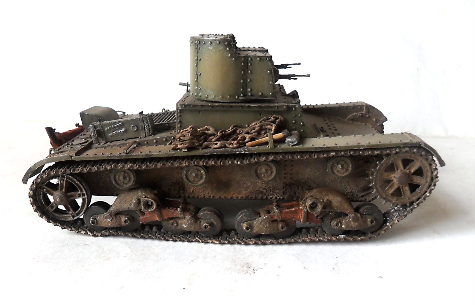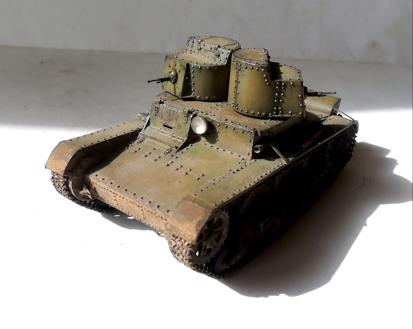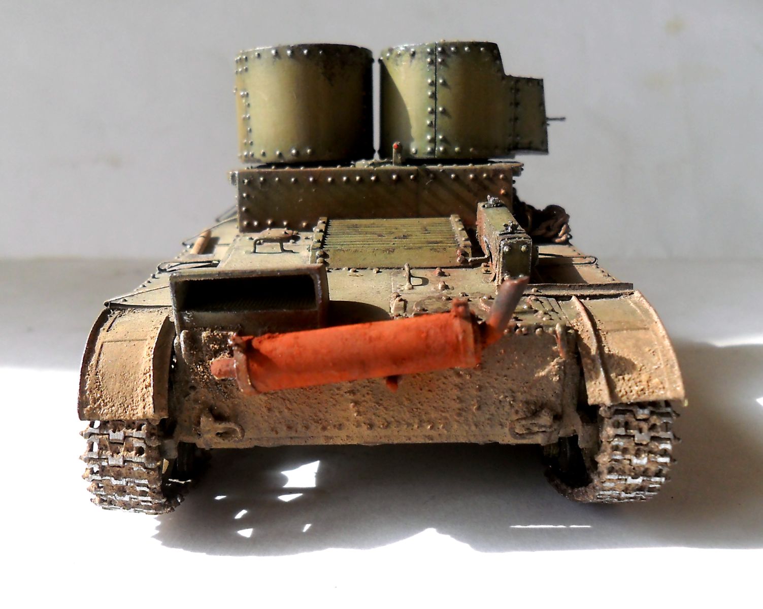 ...Не знаю как кому,мне бросились в газа клёпки на башнях.Их так много и так часто...Ещё увидел,что кожуха на фаре нет.А в основном...очень понравился Ваш танк.